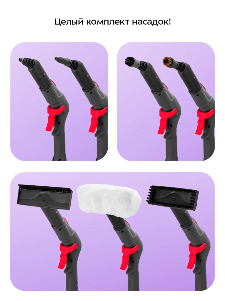 Пароочиститель очищает поверхности от пятен при помощи горячего пара, однако не все пятна могут быть удалены таким способом. В случаях серьезного загрязнения используйте нейлоновую или латунную щетку, а также чистящие средства, которые надо наносить на загрязнения. Для очистки окон, зеркал и кафельной плитки используется насадка с резиновым скребком. Также насадку с резиновым скребком можно использовать для отпаривания вещей. Благодаря наличию парового шланга есть возможность очистить труднодоступные места. Насадка-концентратор может использоваться для очистки плинтусов, щелей между плитками, протектора обуви и других труднодоступных мест. Струйная насадка справится с загрязнениями в таких местах, как углы и радиаторы отопления. Прямоугольная насадка хорошо подходит для очистки не точечных, локальных загрязнений, а более больших площадей, например, плитки в ванной комнате. Напольная насадка, которая подсоединяется к удлинительным трубкам, служит для очистки напольных покрытий.