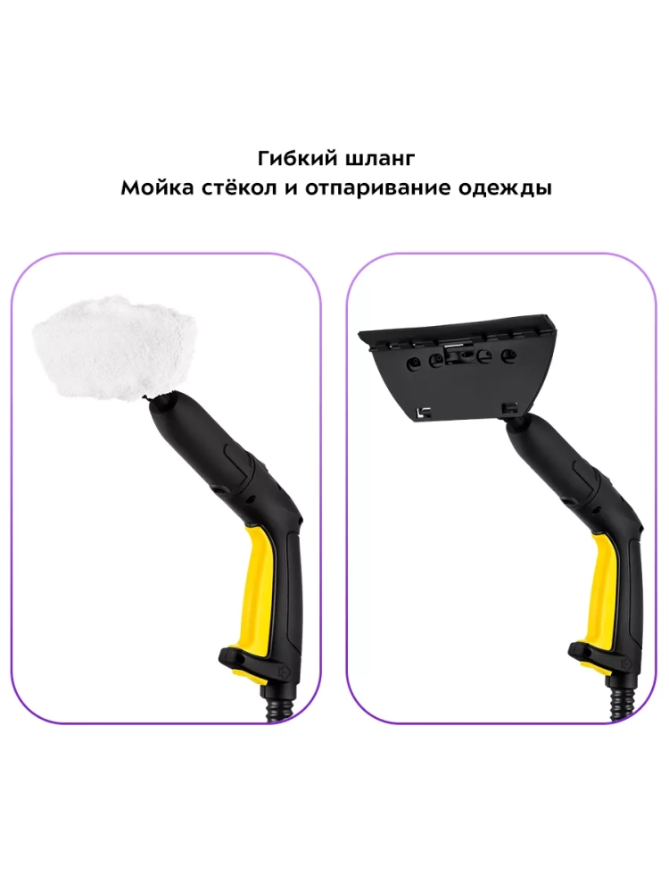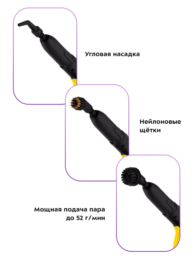 Пароочиститель оснащен ручкой для переноски. Колеса позволяют с легкостью перемещать пароочиститель во время уборки, не поднимая его. Большое количество насадок в комплекте поможет очистить труднодоступные или сильнозагрязненные поверхности.