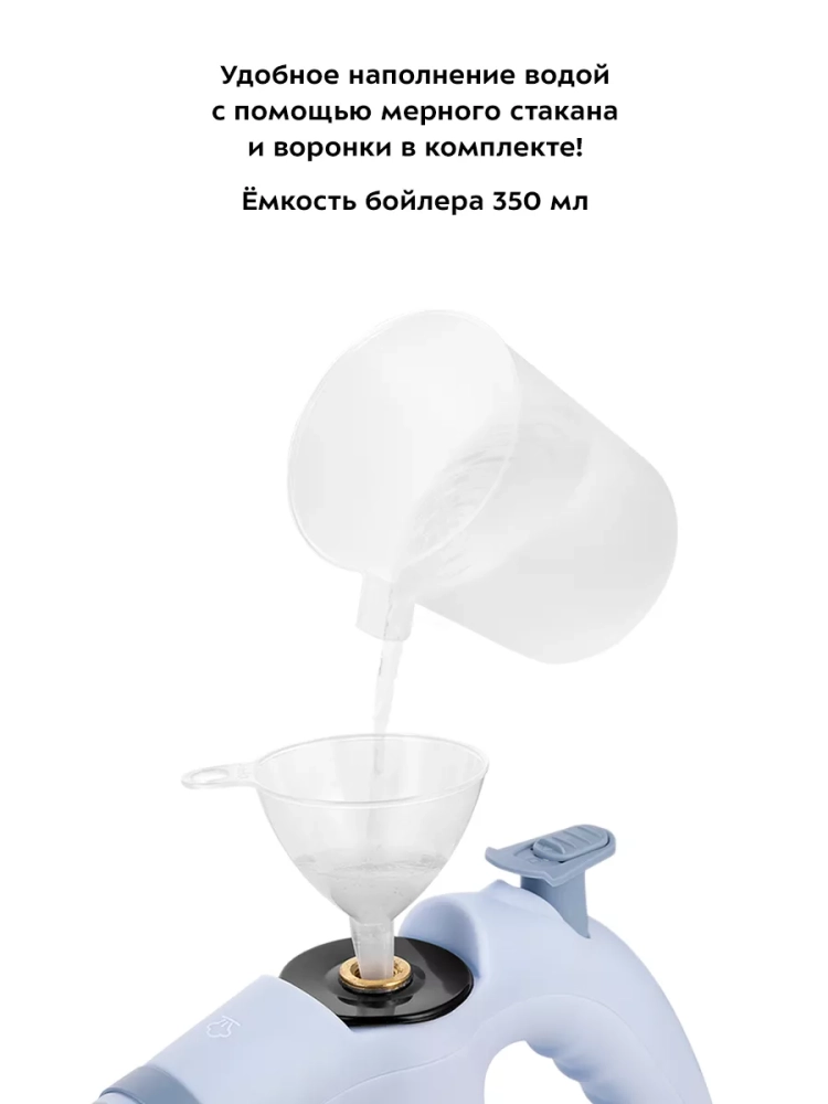 В устройство удобно наливать воду благодаря наличию воронки и мерного стакана.