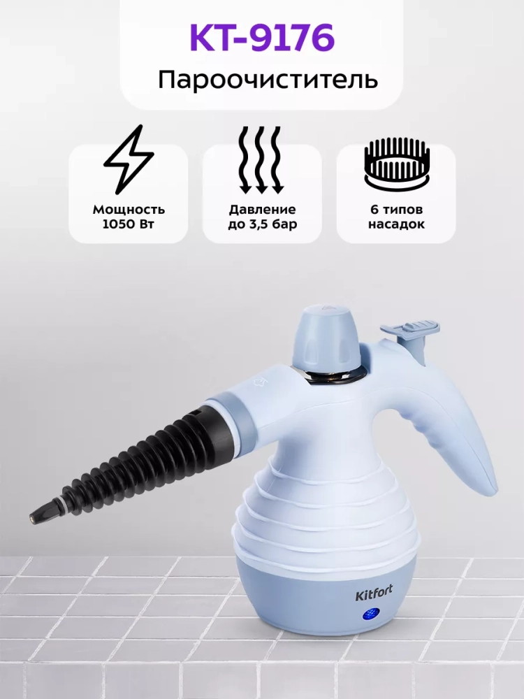 Пароочиститель Kitfort КТ-9176 — многофункциональный прибор, способный заменить дезинфектор, стеклоочиститель и отпариватель. Используя струю горячего пара, пароочиститель отлично очищает поверхности и обеспечивает деликатную глажку вещей. Прибор очень удобен в использовании и работа с ним не требует особых навыков и умений.