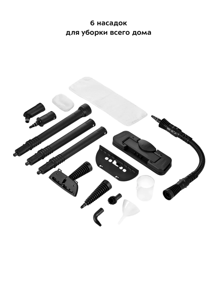 В случаях серьезного загрязнения используйте нейлоновую щетку, а также чистящие средства, которые надо наносить на загрязнения. Для очистки окон, зеркал и кафельной плитки используется насадка с резиновым скребком. Чтобы отпарить одежду и почистить обивку мягкой мебели, в комплекте есть тряпка для отпаривания, которая надевается на насадку для отпаривания. Благодаря наличию парового шланга есть возможность очистить труднодоступные места. Струйная насадка может использоваться для очистки плинтусов, щелей между плитками, протектора обуви и других труднодоступных мест. Угловая насадка справится с загрязнениями в таких местах, как углы и радиаторы отопления. Напольная щетка, которая подсоединяется к удлинительным трубкам, служит для очистки напольных покрытий.