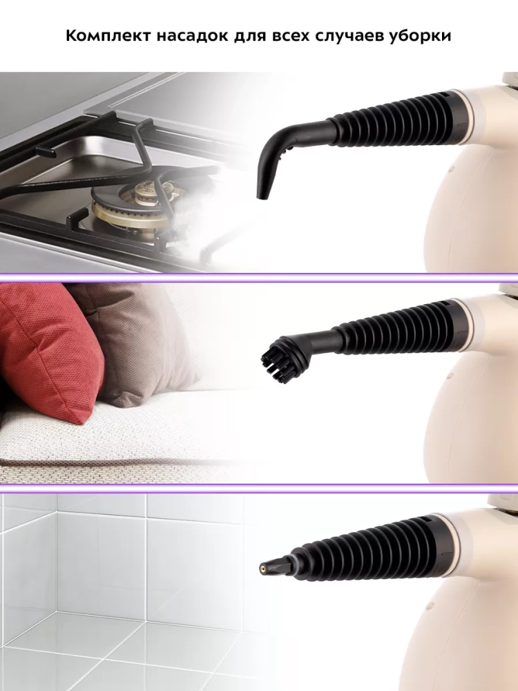 Пароочиститель очищает поверхности от пятен при помощи горячего пара, однако не все пятна могут быть удалены таким способом. Большое количество насадок в комплекте поможет очистить труднодоступные или сильнозагрязненные поверхности.