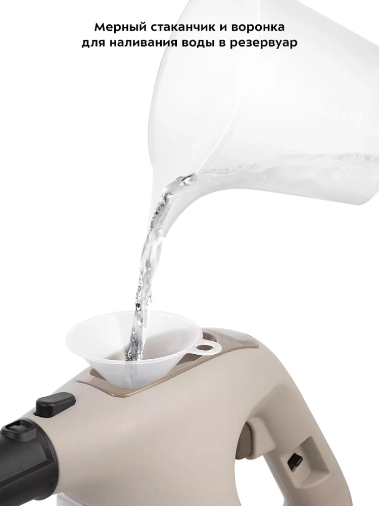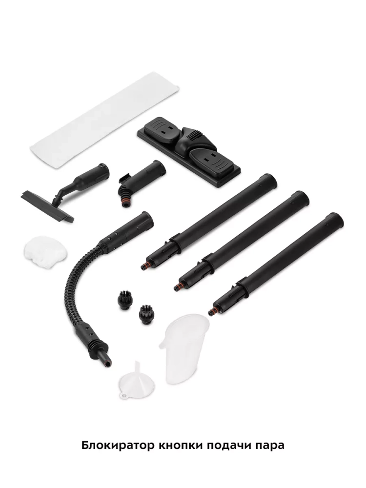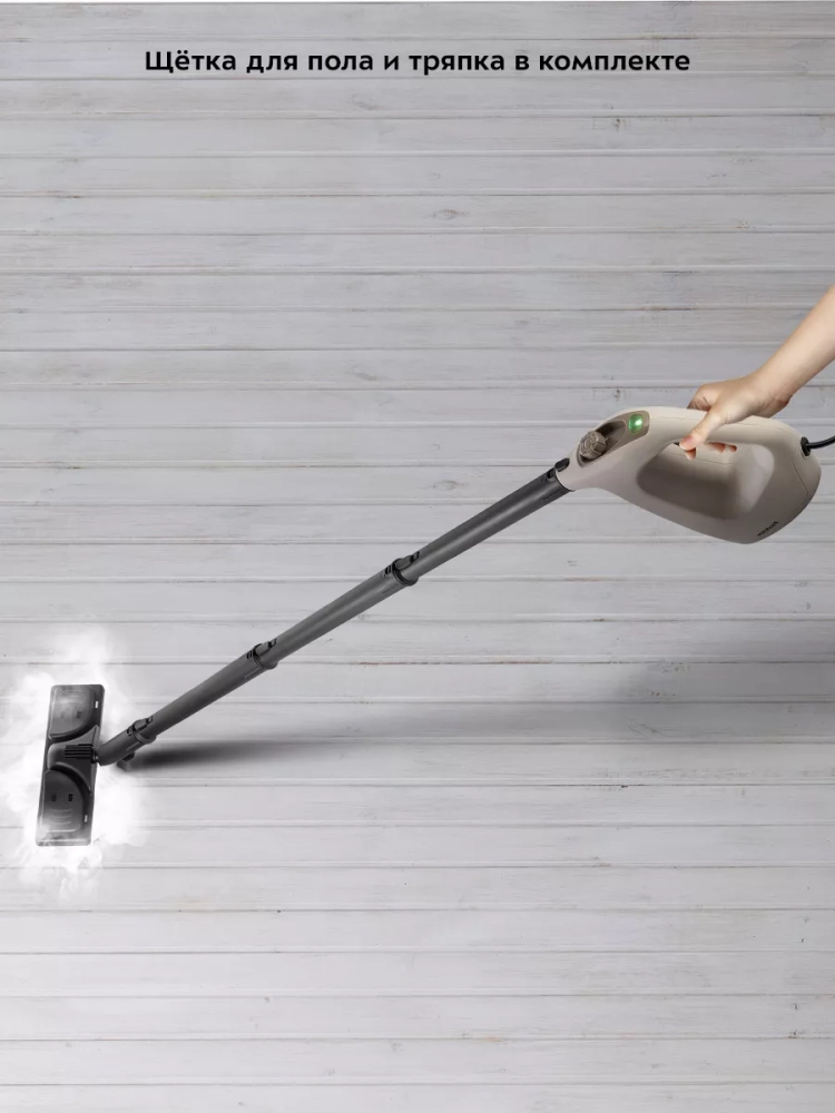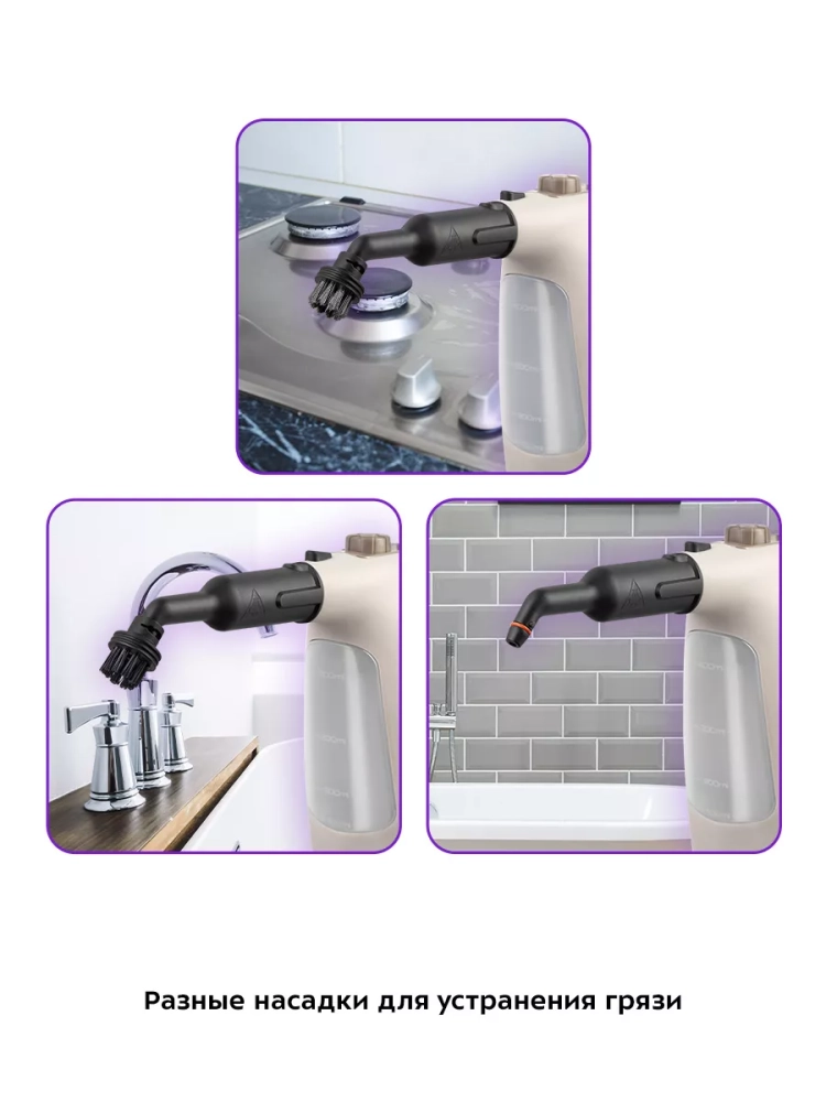 На корпусе пароочистителя есть ручка для переноски. Пароочиститель очищает поверхности от загрязнений при помощи горячего пара, однако не все загрязнения могут быть удалены таким способом. В случаях сильного загрязнения используйте вспомогательные насадки из комплекта, а также чистящие средства, которые надо наносить на загрязнения. Большое количество насадок в комплекте поможет очистить труднодоступные или сильнозагрязненные поверхности.