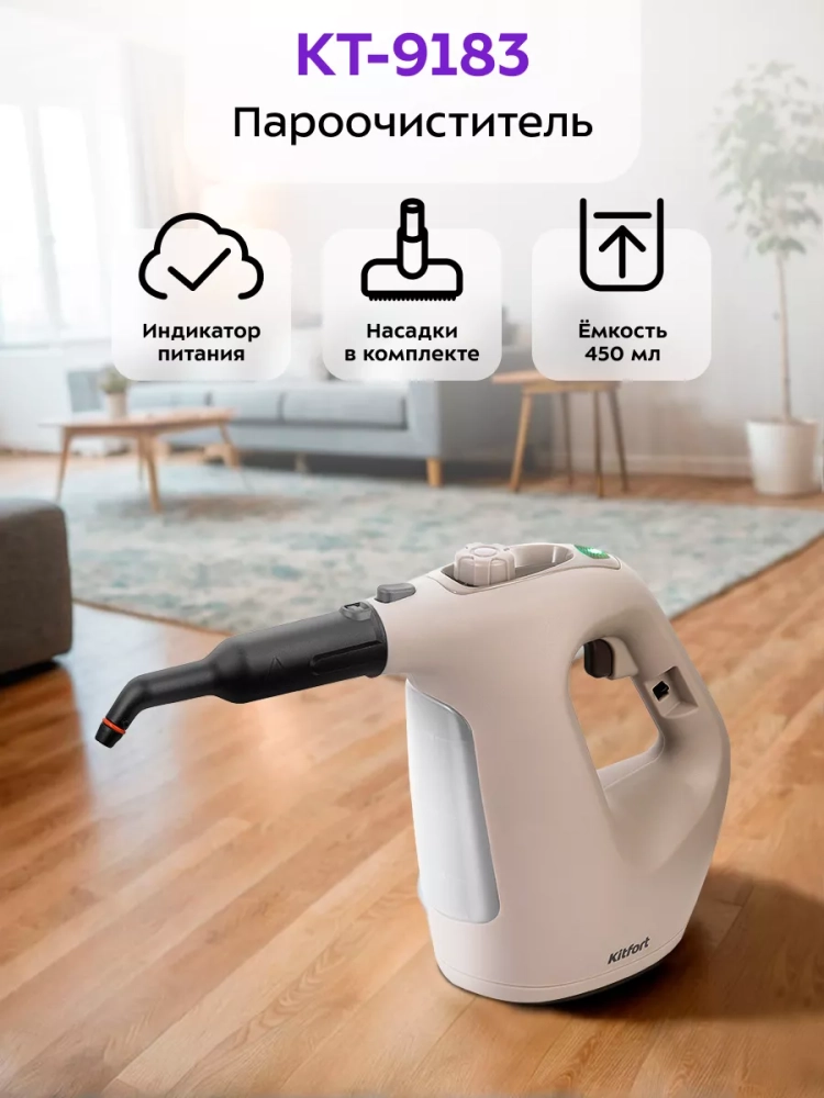 Пароочиститель Kitfort КТ-9183 предназначен для уборки интерьеров, полов и поверхностей, выдерживающих влагу и высокую температуру, а также для отпаривания тканей.