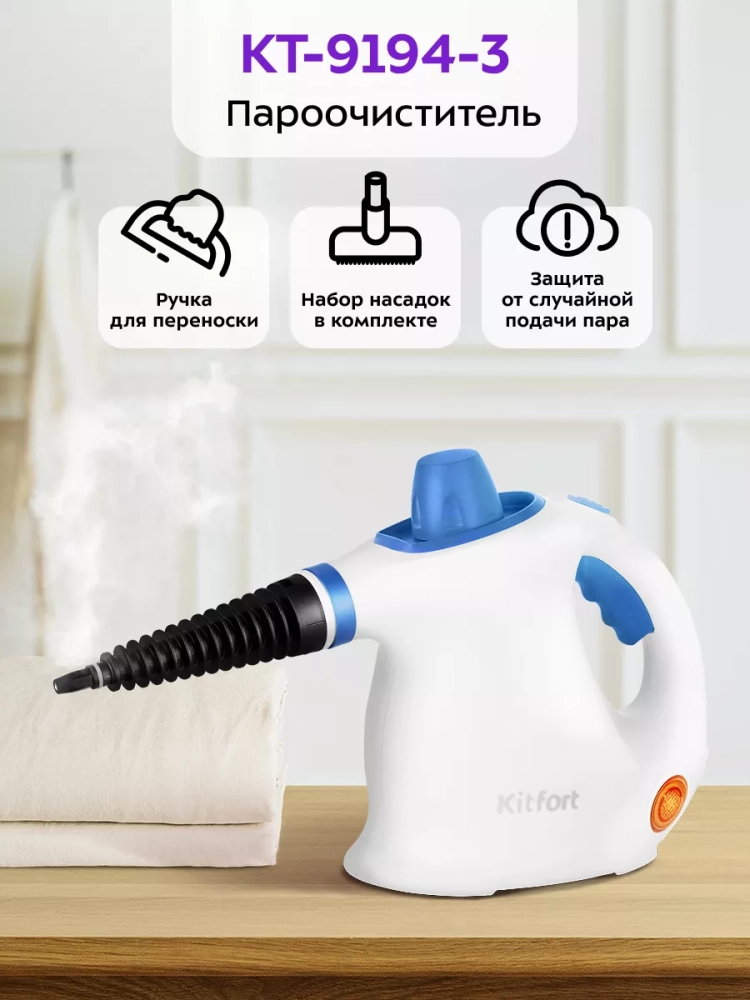 Пароочиститель Kitfort КТ-9194 — многофункциональный прибор, способный заменить паровую швабру, дезинфектор, стеклоочиститель и отпариватель для тканей. Используя струю горячего пара, пароочиститель отлично очищает поверхности и обеспечивает деликатную глажку вещей. Прибор очень удобен в использовании и работа с ним не требует особых навыков и умений.