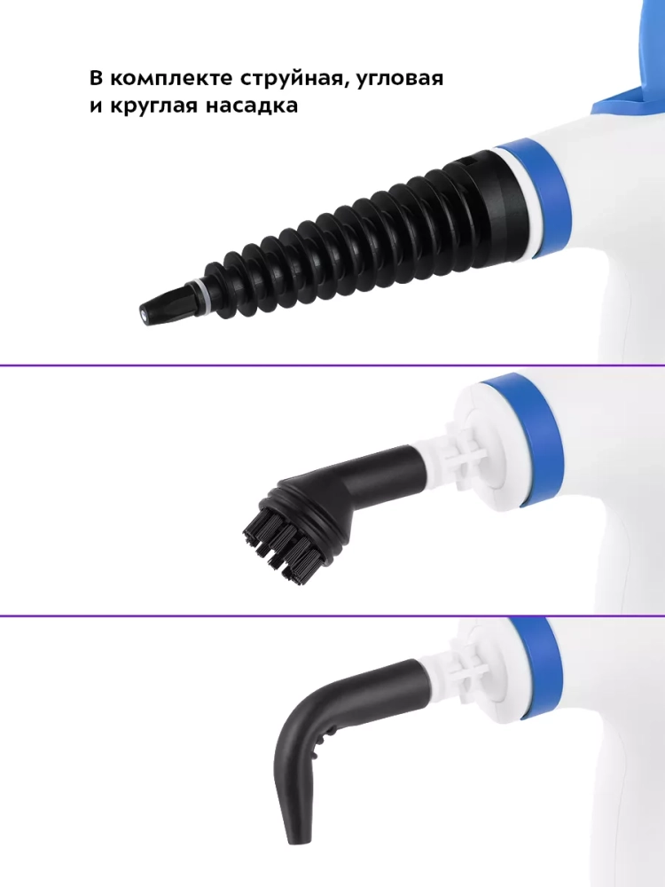 Пароочиститель очищает поверхности от пятен при помощи горячего пара, однако не все пятна могут быть удалены таким способом. Большое количество насадок в комплекте поможет очистить труднодоступные или сильнозагрязненные поверхности.