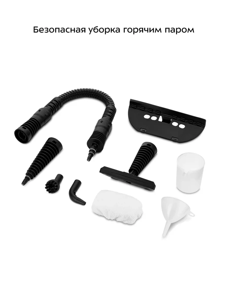 В случаях серьезного загрязнения используйте нейлоновую щетку, а также чистящие средства, которые надо наносить на загрязнения. Для очистки окон, зеркал и кафельной плитки используется насадка с резиновым скребком. Чтобы отпарить одежду и почистить обивку мягкой мебели, в комплекте есть тряпка для отпаривания, которая надевается на насадку для отпаривания. Благодаря наличию парового шланга есть возможность очистить труднодоступные места. Струйная насадка может использоваться для очистки плинтусов, щелей между плитками, протектора обуви и других мест. Угловая насадка справится с загрязнениями в таких местах, как углы и радиаторы отопления.