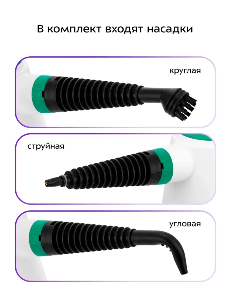 Пароочиститель очищает поверхности от пятен при помощи горячего пара, однако не все пятна могут быть удалены таким способом. Большое количество насадок в комплекте поможет очистить труднодоступные или сильнозагрязненные поверхности.