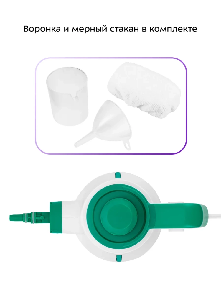 В устройство удобно наливать воду благодаря наличию воронки и мерного стакана.