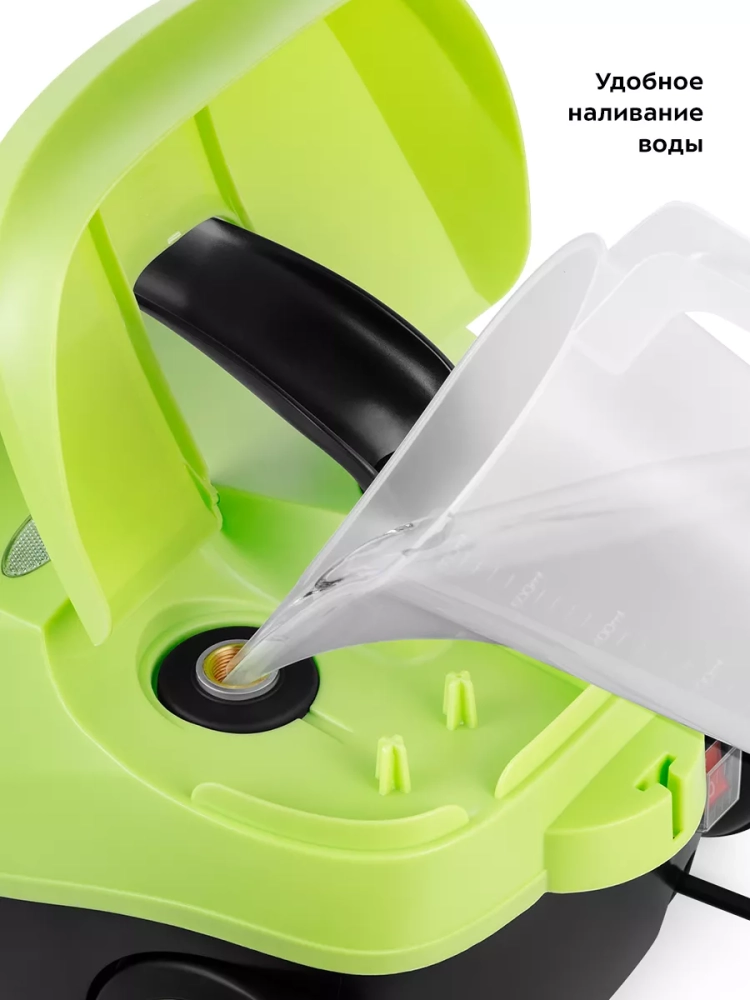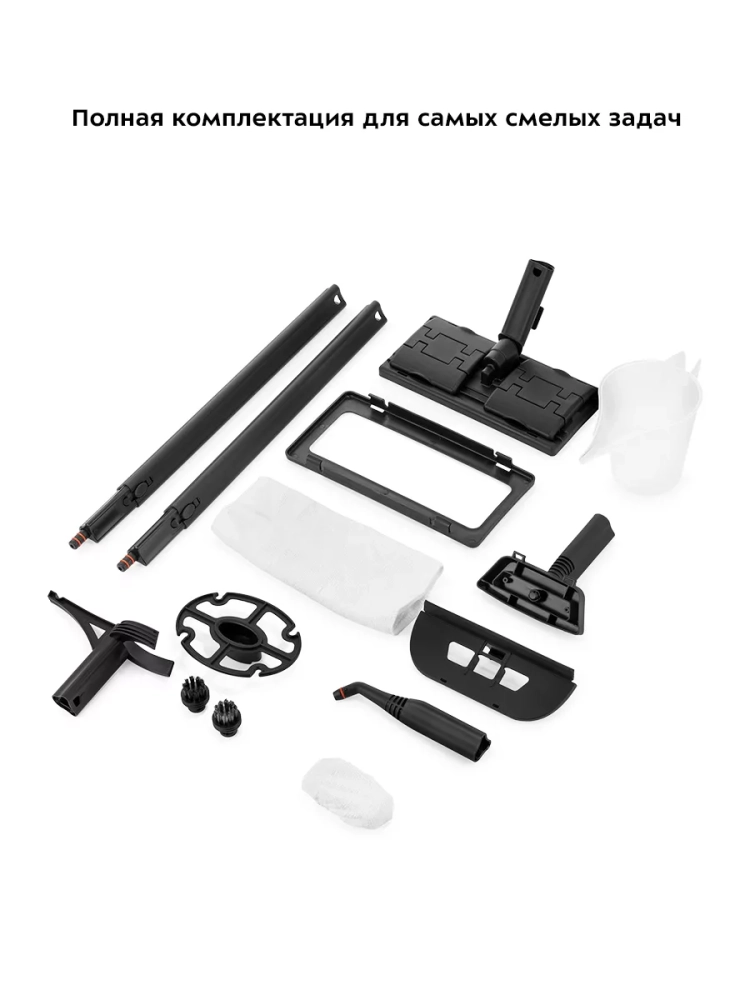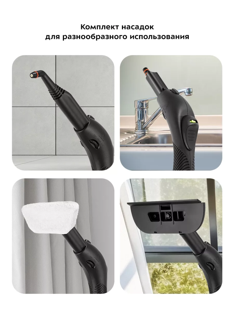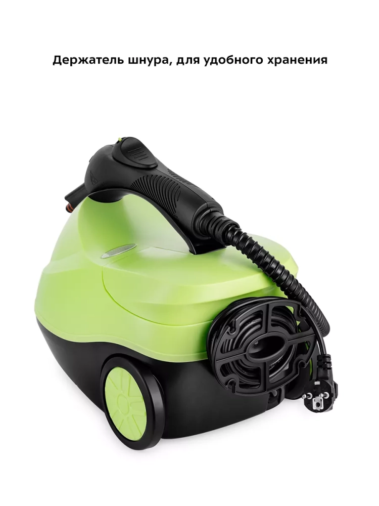 На корпусе пароочистителя есть ручка для переноски, которая также является держателем парового пистолета при хранении прибора. Колеса позволяют с легкостью перемещать пароочиститель, не поднимая его. Большое количество насадок в комплекте поможет очистить труднодоступные или сильнозагрязненные поверхности. Под крышкой пароочистителя предусмотрено место для хранения стальной и нейлоновой щеток и крышка бойлера.