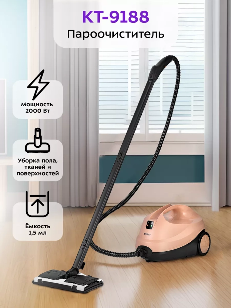Пароочиститель Kitfort КТ-9188 предназначен для уборки полов и поверхностей, находящихся как внутри, так и вне помещений.