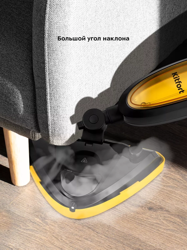 Паровая швабра обладает большим углом наклона при уборке, который поможет легко убирать пространство под мебелью. Также у паровой швабры предусмотрены держатели для шнура.