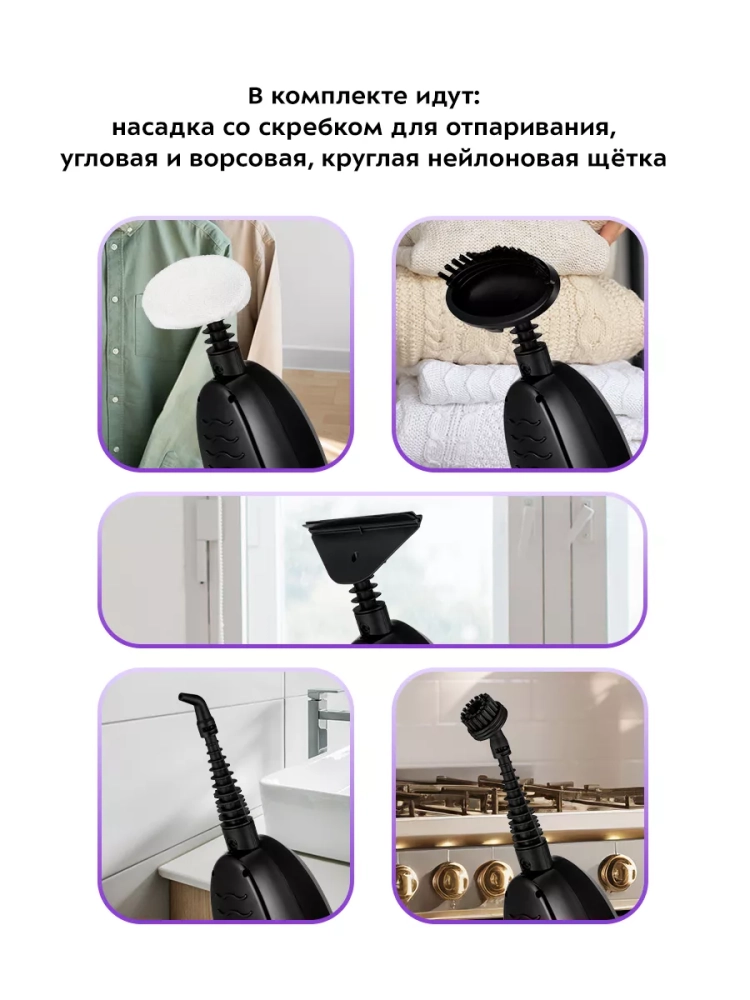 Конструкция «2 в 1» предусматривает наличие ручного модуля паровой щвабры, который удобно использовать с насадками. С помощью насадок можно очистить большинство вещей в доме: легко отмыть окна, отпарить шторы и мягкую мебель. Нейлоновые щетки эффективно очищают сложные загрязнения с помощью механического воздействия. Для очистки окон, зеркал и кафельной плитки предусмотрена специальная насадка со скребком. Насадку для отпаривания можно использовать с тряпкой для отпаривания, чтобы отпаривать одежду и чистить обивку мягкой мебели. У напольной насадки есть крепления для тряпки и резервуар для моющих средств, это дает возможность использовать специальные средства для мытья полов при желании.