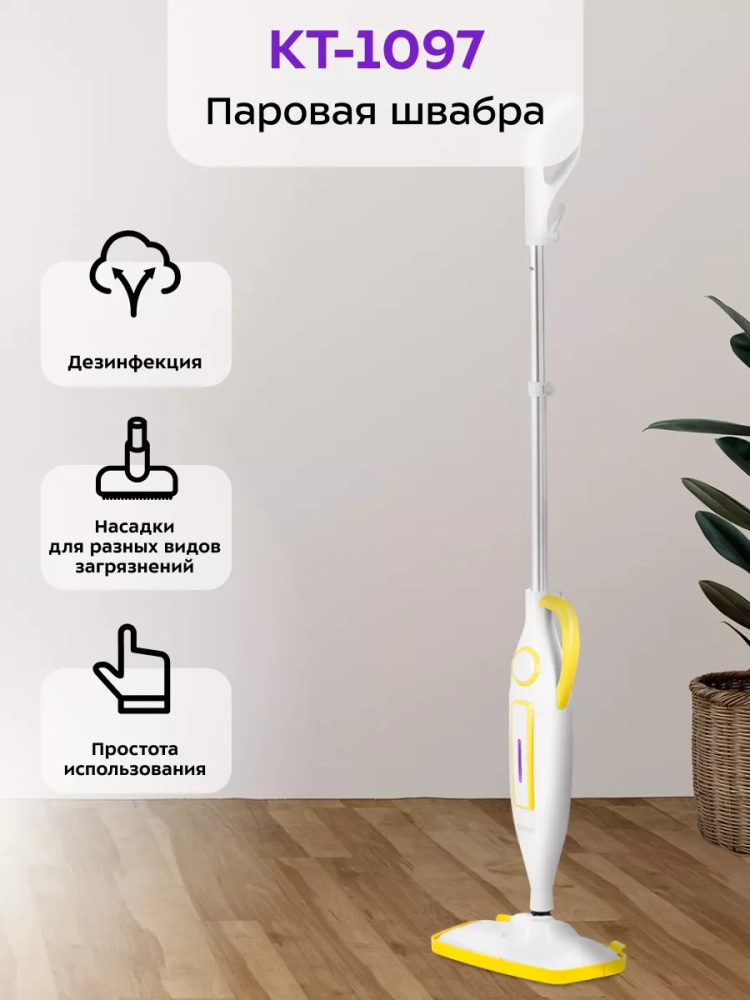 Паровая швабра КТ-1097 очень легкая и простая в использовании. Уборка с ней будет проходить быстро и легко.