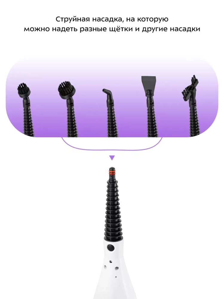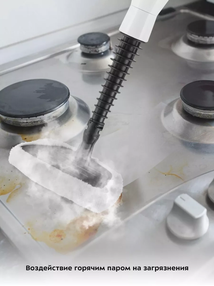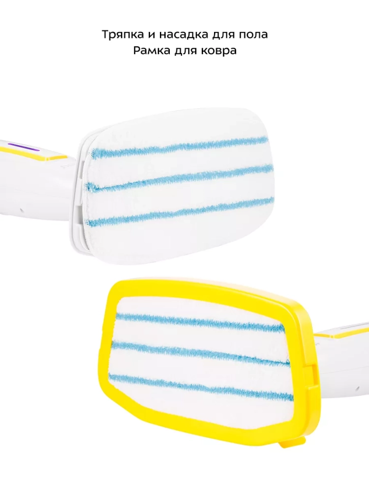 Конструкция «2 в 1» предусматривает использование ручного модуля паровой швабры с насадками без присоединения к нему удлинительной ручки. Большое количество насадок в комплекте поможет очистить труднодоступные или сильнозагрязненные поверхности, а также легко отмыть окна, почистить шторы и мягкую мебель. Скребок и нейлоновые щетки эффективно очищают сложные загрязнения с помощью механического воздействия. Струйная и угловая насадки помогут очистить щели и углы. Для очистки окон, зеркал и кафельной плитки используется насадка для отпаривания с резиновым скребком. Чтобы отпаривать одежду и чистить обивку мягкой мебели, в комплекте есть тряпка для отпаривания, которая надевается на насадку для отпаривания.