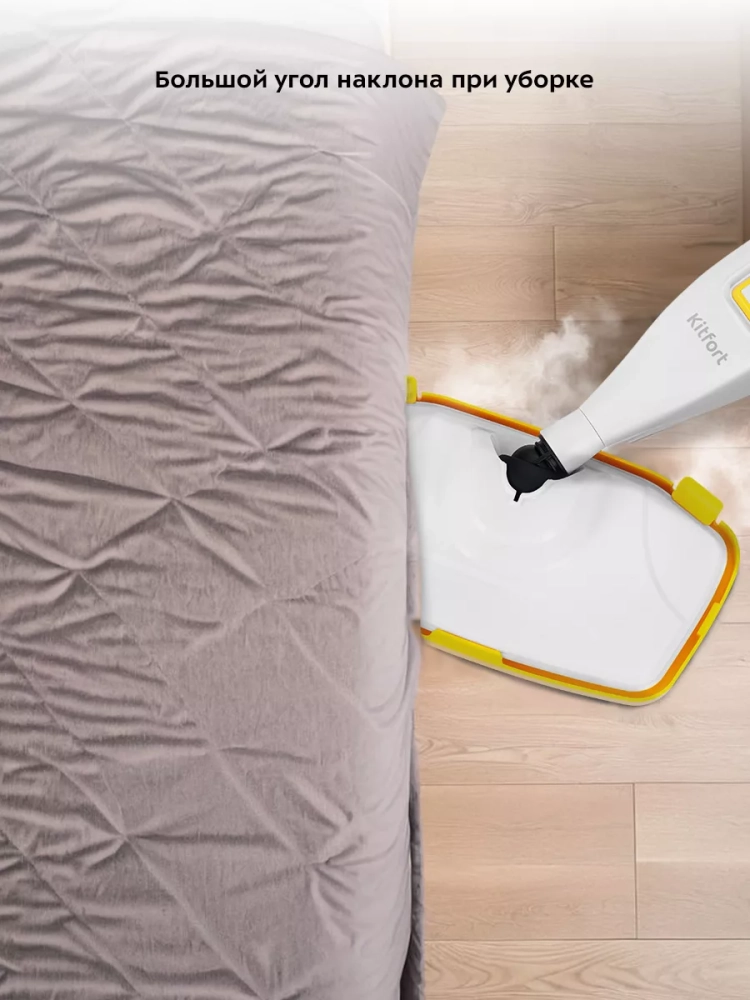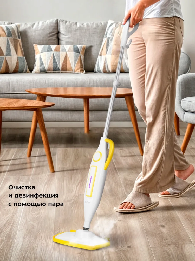 Паровая швабра Kitfort КТ-1097 — универсальное устройство, которое поможет избавиться от пыли и грязи с помощью мощной струи пара, а также продезинфицирует обрабатываемую поверхность. Паровая швабра очистит раковину и плиту на кухне, зеркала и мебель без каких-либо химических средств, исключительно паром.