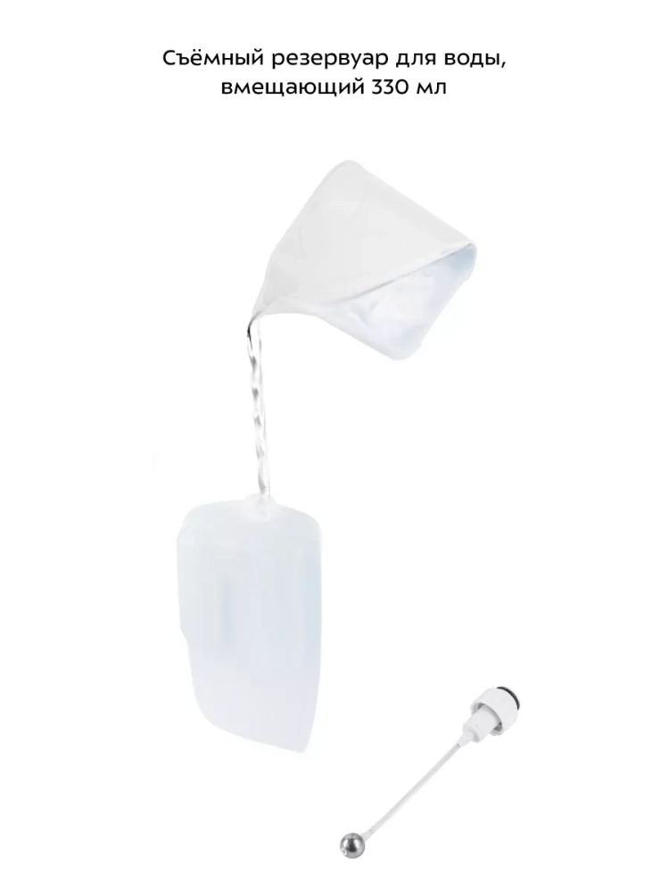 Устройство оснащено съемным резервуаром для воды емкостью 330 мл, что позволяет производить непрерывную уборку до 16 минут.