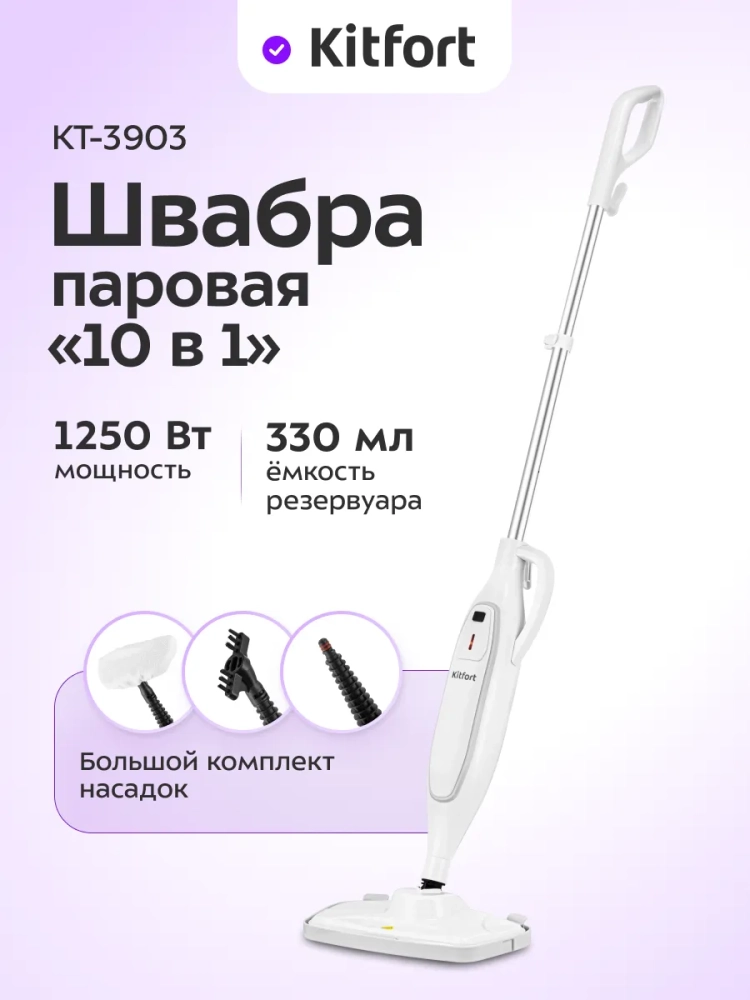 Паровая швабра Kitfort КТ-3903 — универсальное устройство, которое поможет избавиться от пыли и грязи с помощью мощной струи пара, а также продезинфицирует обрабатываемую поверхность. Паровая швабра очистит раковину и плиту на кухне, зеркала и мебель без каких-либо химических средств, исключительно паром.