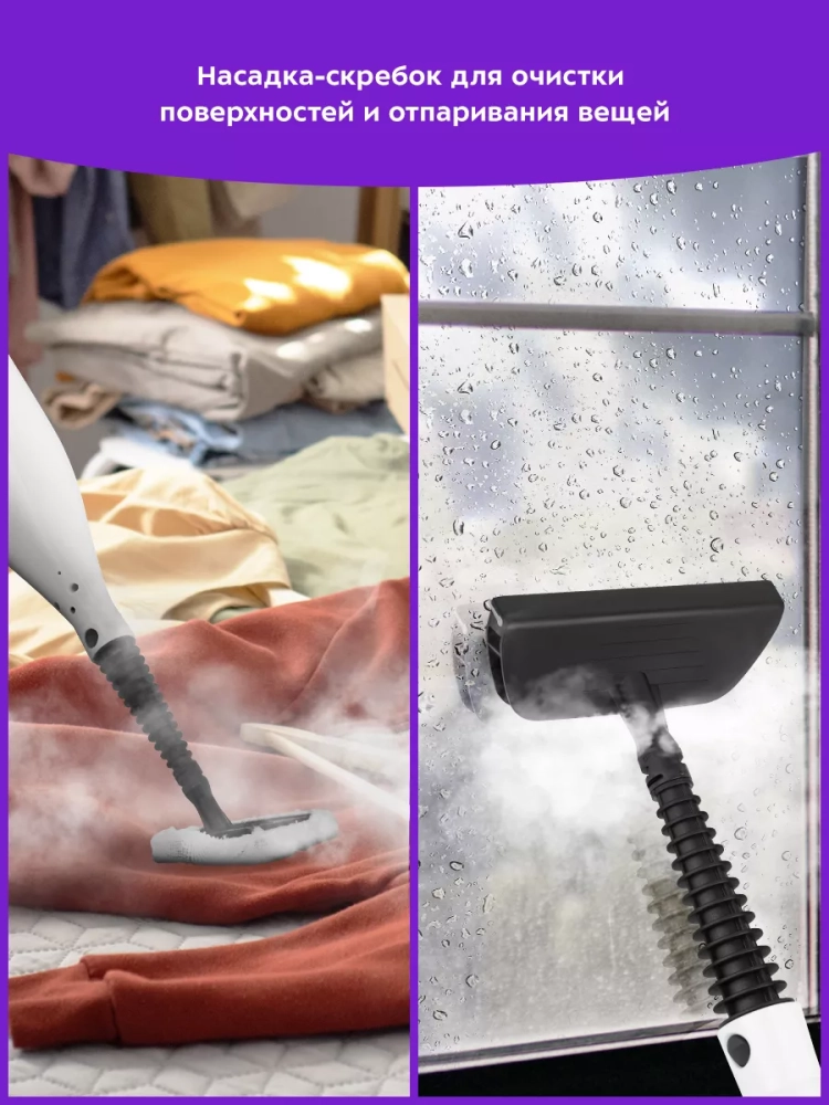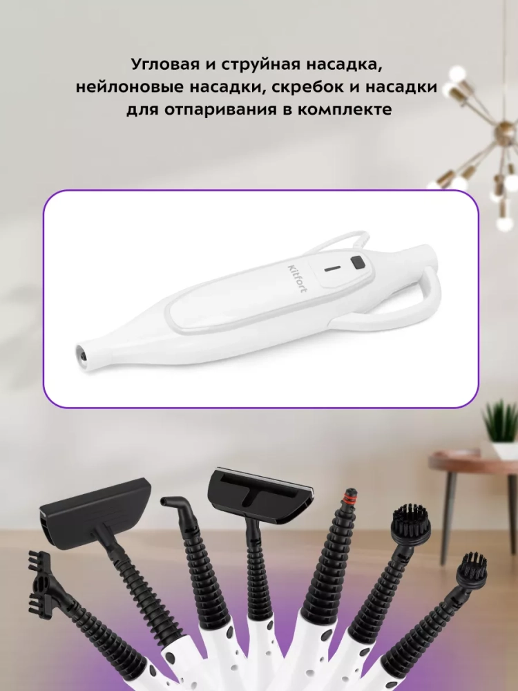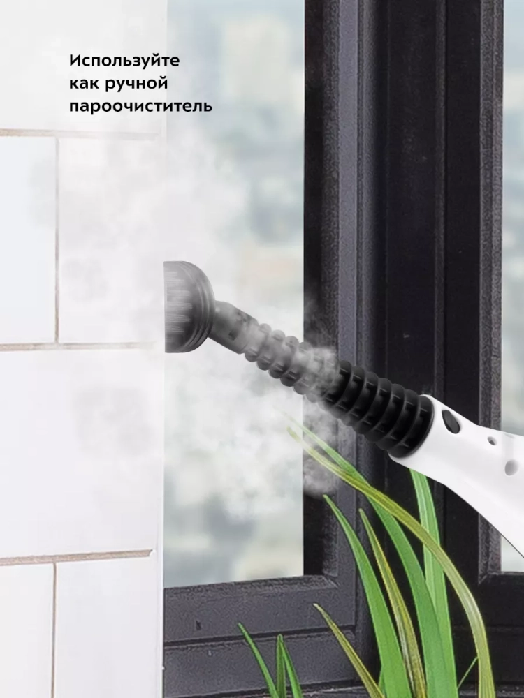 Конструкция «2 в 1» предусматривает наличие ручного модуля, который удобно использовать с насадками. С помощью насадок можно очистить большинство вещей в доме: легко отмыть окна, почистить шторы и мягкую мебель. Скребок, плоская и круглые нейлоновые щетки эффективно очищают сложные загрязнения с помощью механического воздействия. Струйная и угловая насадки помогут очистить щели и углы. Для очистки окон, зеркал и кафельной плитки предусмотрена специальная насадка для отпаривания с резиновым скребком. Ее можно использовать с тряпкой для отпаривания, чтобы отпаривать одежду и чистить обивку мягкой мебели. Для удобства использования ручного модуля на корпусе устройства есть специальная ручка для переноски.