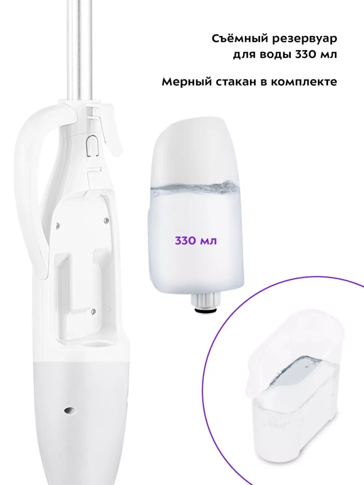 Устройство оснащено съемным резервуаром для воды емкостью 330 мл, что позволяет производить непрерывную уборку до 16 минут.
