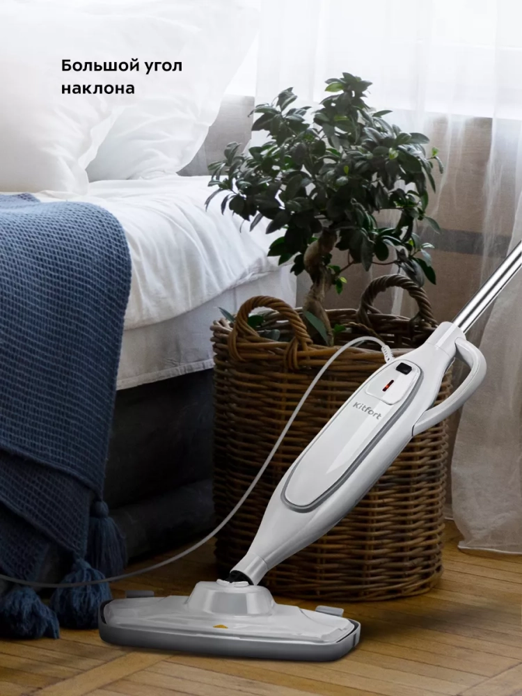 Паровая швабра обладает функцией вертикальной парковки и большим углом наклона при уборке, который поможет легко убирать пространство под мебелью. Напольная щетка закреплена на специальном шарнире с наклоном в двух плоскостях, что делает швабру очень маневренной и облегчает процесс уборки. На рукоятке и корпусе устройства предусмотрены держатели для шнура.