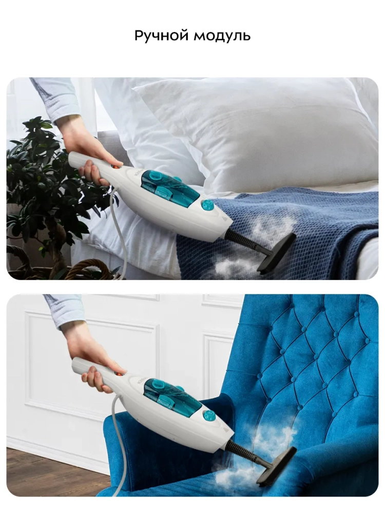 Конструкция «2 в 1» предусматривает использование ручного модуля паровой швабры с насадками без присоединения к корпусу.