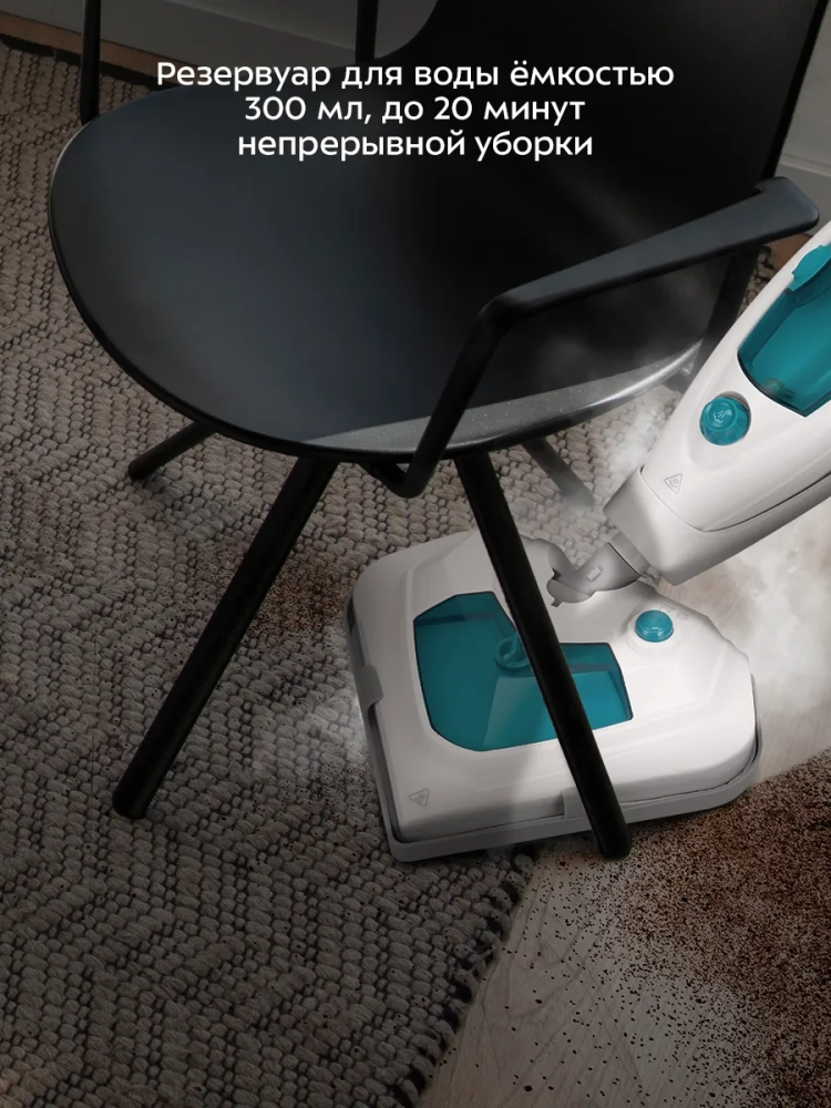 Устройство оснащено съемным резервуаром для воды емкостью 300 мл, что позволяет производить непрерывную уборку до 12–20 минут в зависимости от интенсивности выходящего пара. Регулятор подачи пара позволяет плавно настраивать интенсивность выходящего пара. Чем сильнее загрязнение, тем больше пара потребуется.