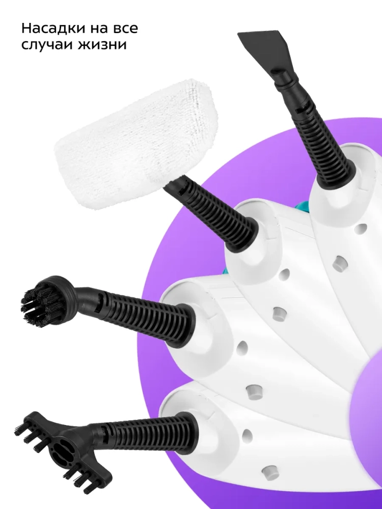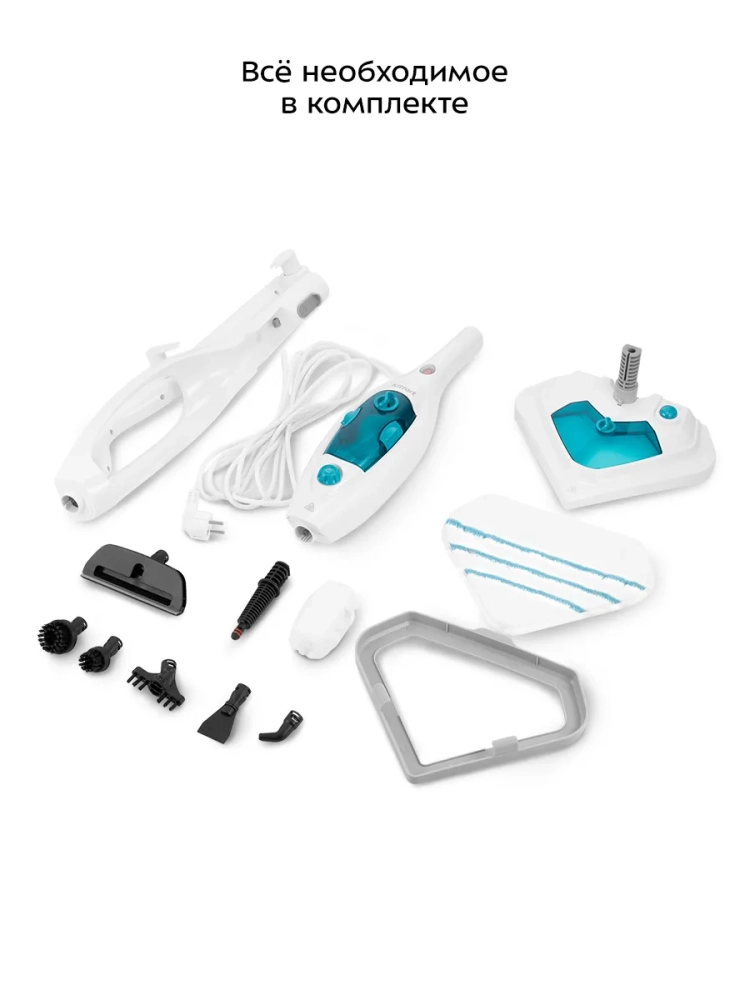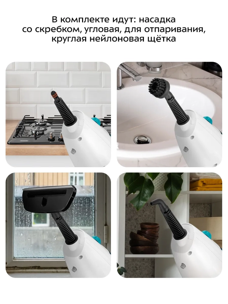 Струйная и угловая насадки помогут очистить щели и углы. Скребок и нейлоновые щетки эффективно очищают сложные загрязнения с помощью механического воздействия. Для очистки окон, зеркал и кафельной плитки используется насадка с резиновым скребком. Если на данную насадку надеть тряпку для отпаривания, насадка может использоваться для отпаривания одежды и чистки обивки мягкой мебели. С помощью мерного стакана из комплекта удобно заполнять резервуар для воды.