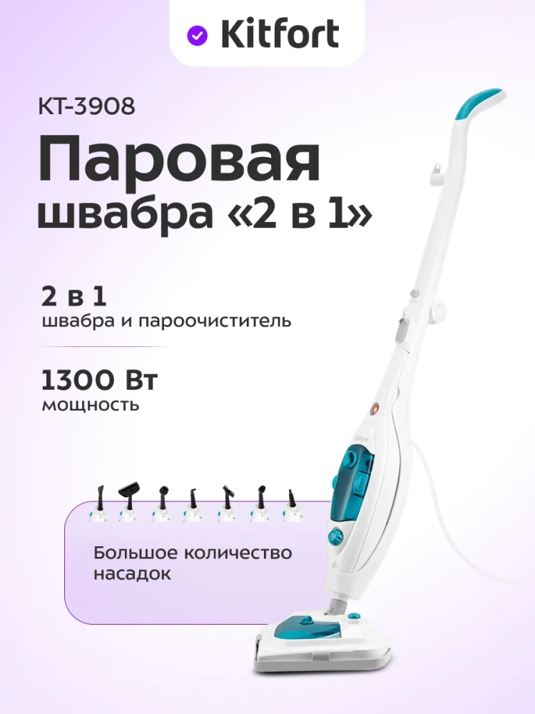 Паровая швабра Kitfort КТ-3908 — универсальное устройство, которое поможет избавиться от пыли и грязи с помощью мощной струи пара, а также продезинфицирует обрабатываемую поверхность. При помощи специальных насадок из комплекта КТ-3908 очистит напольные покрытия, раковину и плиту на кухне, зеркала, окна и плитку в ванной без каких-либо химических средств, исключительно паром.