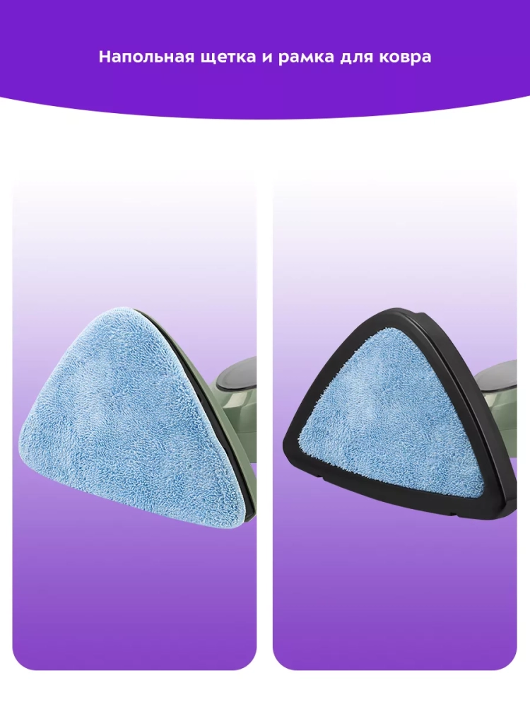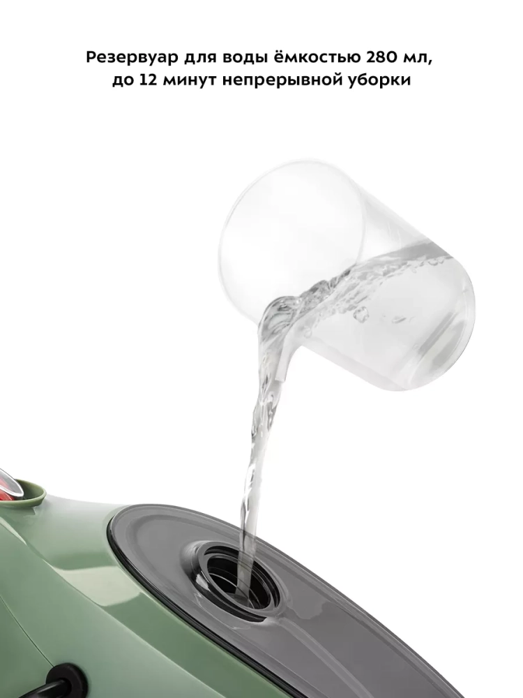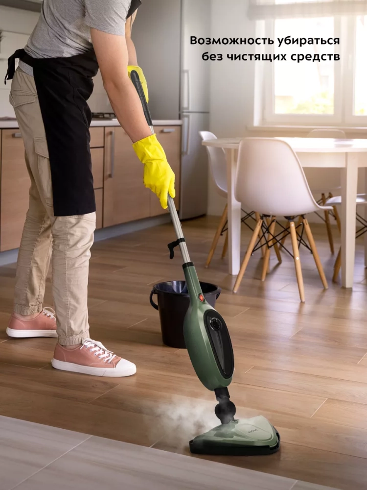 Принцип действия паровой швабры основан на воздействии горячего пара на загрязнения. Пар проникает внутрь загрязнения, размягчая и растворяя его, а затем с помощью тряпки частички грязи смываются. Нерастворимое в воде загрязнение (например, жировое пятно) удаляется аналогичным образом: под действием высокой температуры пара оно размягчается, а пар вместе с механическим воздействием на загрязнение превращает его в эмульсию. Эту эмульсию затем можно легко удалить тряпкой. Для паровой швабры не нужны чистящие средства, поэтому она станет идеальным решением для уборки дома для аллергиков. В комплекте так же есть рамка для ковра.