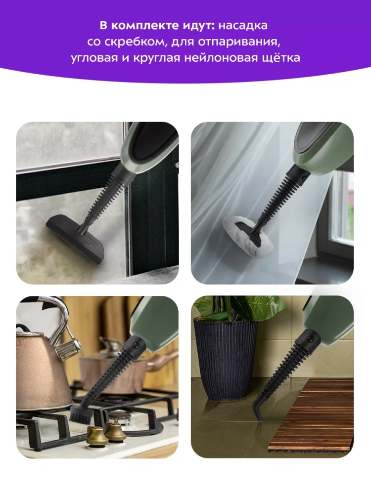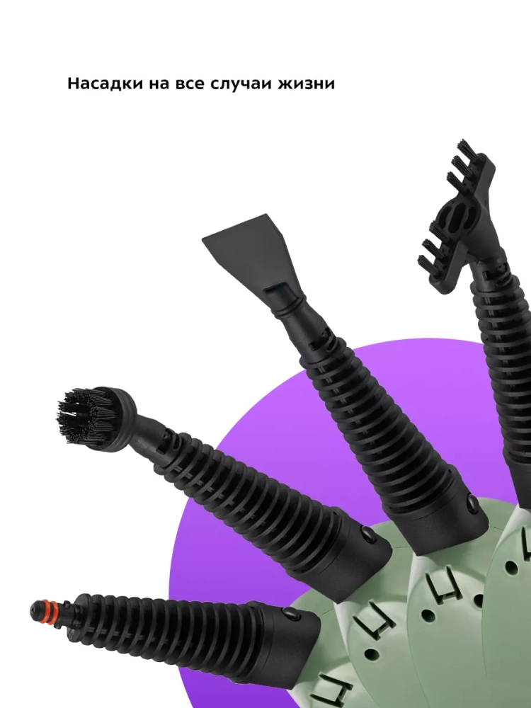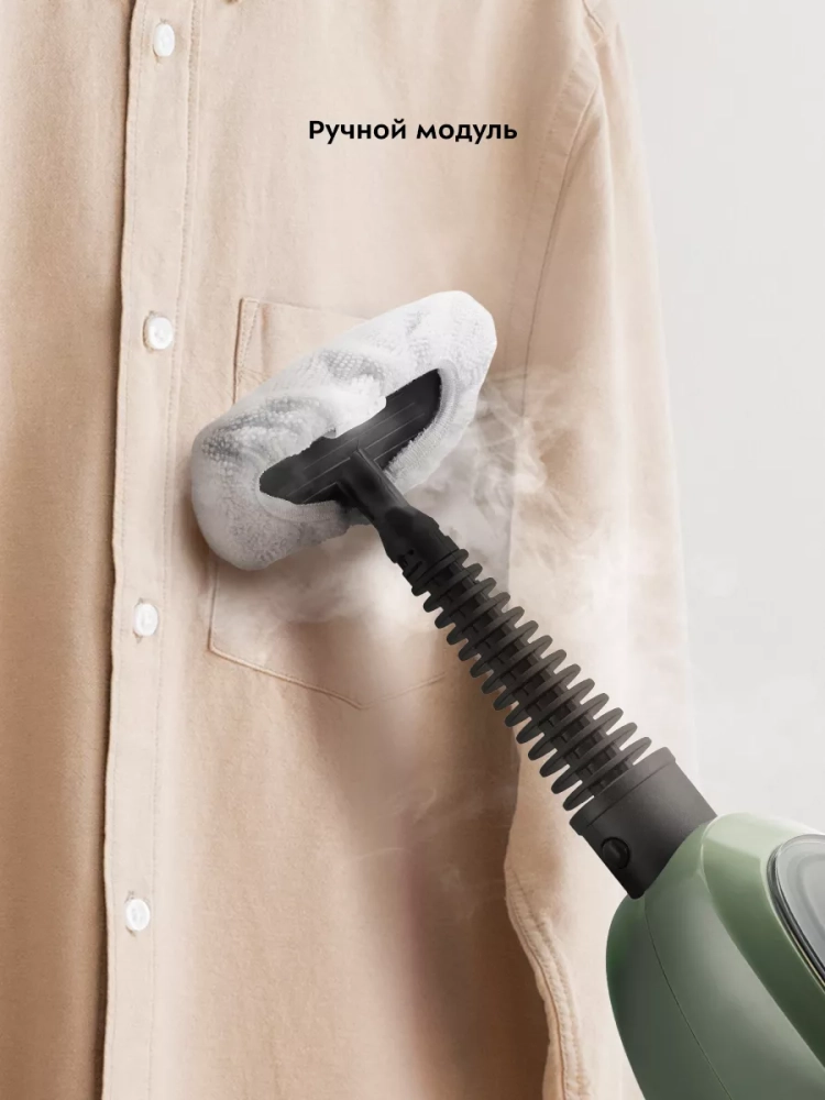 Конструкция «2 в 1» предусматривает использование ручного модуля паровой швабры с насадками без присоединения к нему удлинительной ручки. Большое количество насадок в комплекте поможет очистить труднодоступные или сильнозагрязненные поверхности. Скребок и нейлоновые щетки эффективно очищают сложные загрязнения с помощью механического воздействия. Для очистки окон, зеркал и кафельной плитки используется насадка для отпаривания со скребком. С помощью тряпки для отпаривания насадка может использоваться для отпаривания одежды и чистки обивки мягкой мебели. Струйная и угловая насадки помогут очистить щели и углы.