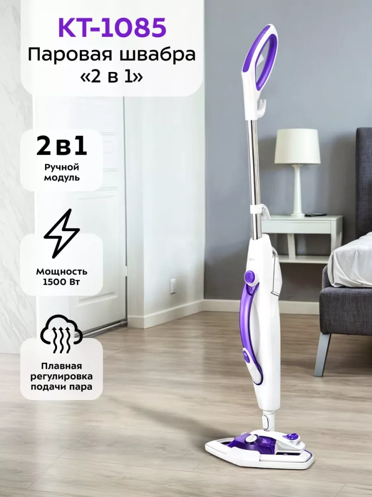 Паровая швабра КТ-1085 очень легкая и простая в использовании. Уборка с ней будет проходить быстро и легко.