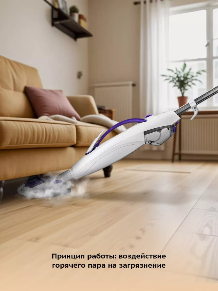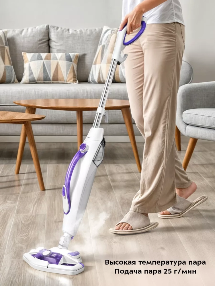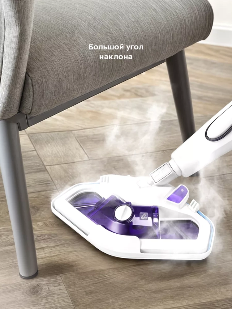Паровая швабра обладает функцией вертикальной парковки и большим углом наклона при уборке, который поможет убрать пространство под мебелью. На устройстве предусмотрены держатели для шнура.