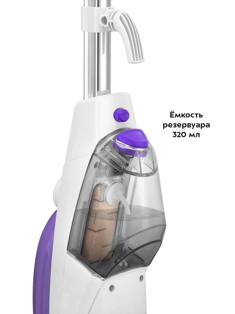 Устройство оснащено резервуаром для воды емкостью 320 мл, что позволяет производить непрерывную уборку до 11 минут.