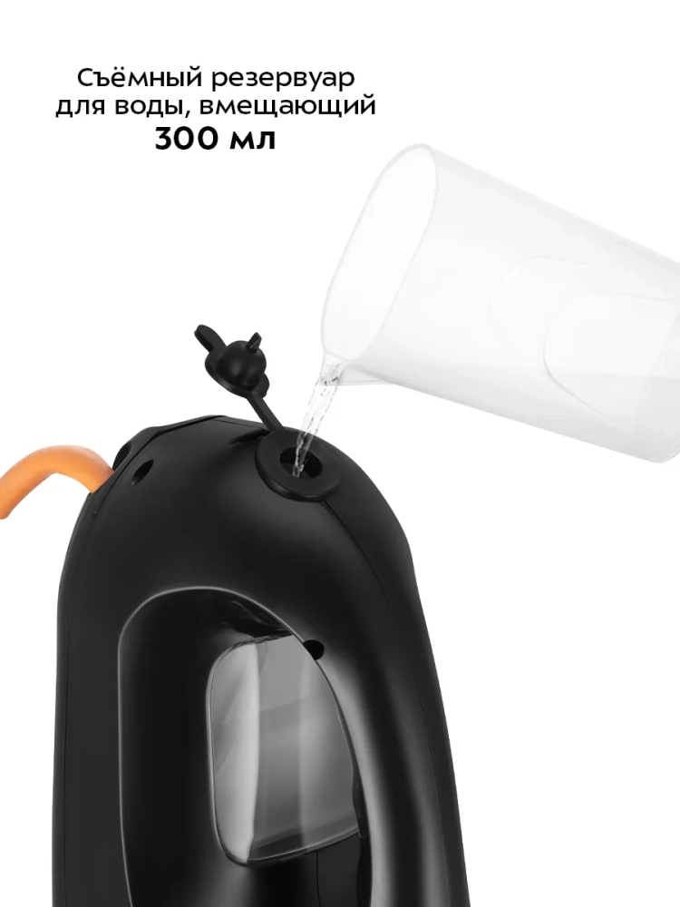Устройство оснащено съемным резервуаром для воды емкостью 300 мл, что позволяет производить непрерывную уборку до 10–15 минут, в зависимости от уровня подачи пара. Два уровня подачи пара позволяют выбрать интенсивность выходящего пара.