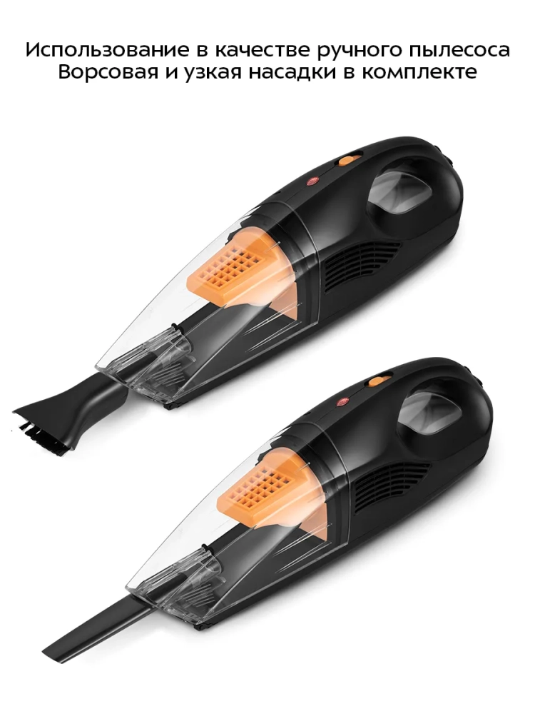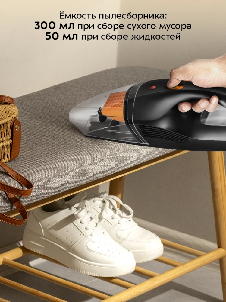 Для использования устройства в качестве ручного пылесоса в комплекте предусмотрены ворсовая и узкая насадки. Кроме того, вы можете использовать ручной пылесос без насадок (для уборки гладких поверхностей). Емкость пылесборника ручного пылесоса составляет 300 мл при сборе сухого мусора и 50 мл при всасывании жидкостей.