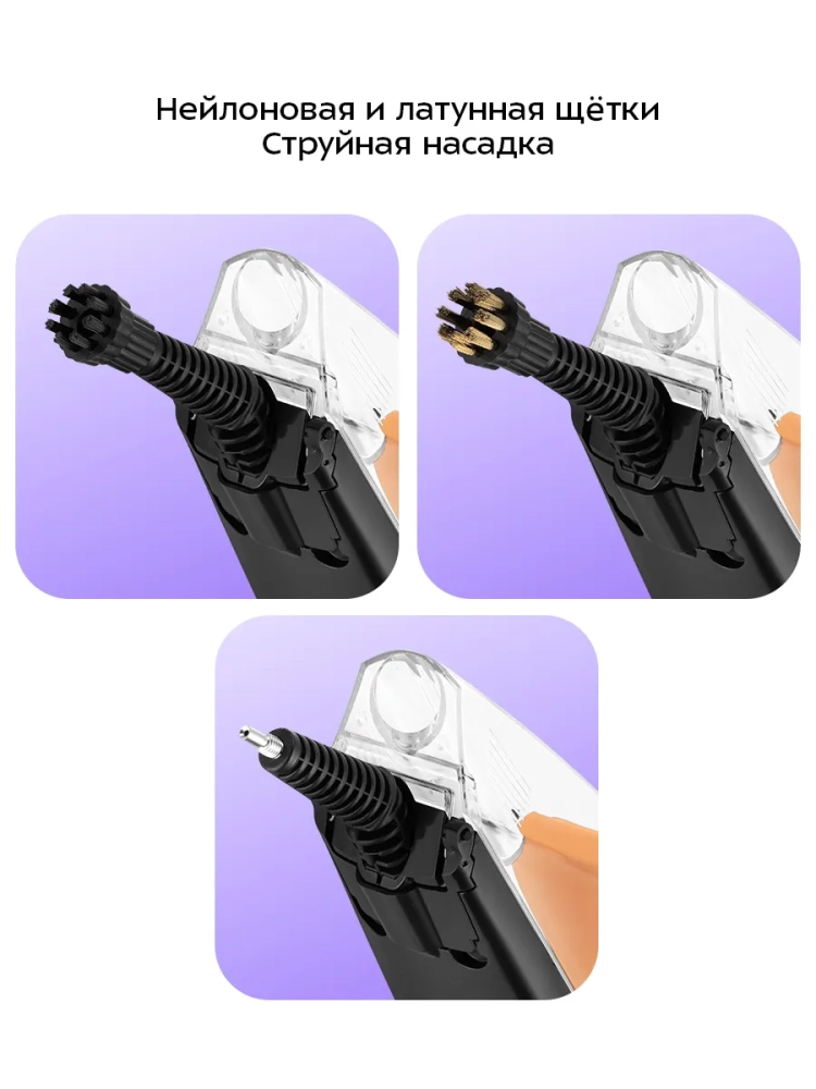 Конструкция «2 в 1» предусматривает использование ручного модуля паровой швабры с насадками без присоединения к нему удлинительной трубки с рукояткой. Насадки в комплекте помогут очистить труднодоступные или сильнозагрязненные поверхности. Струйная насадка подходит для очищения щелей и углов. Латунная и нейлоновая щетки эффективно очищают сложные загрязнения посредством механического воздействия. Спица для чистки предназначена для удаления загрязнений в паровом сопле ручного модуля и насадок.