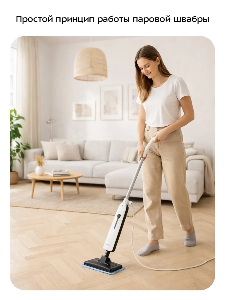 Принцип действия паровой швабры основан на воздействии горячего пара на загрязнения. Пар проникает внутрь загрязнения, размягчая и растворяя его, а затем с помощью тряпки частички грязи смываются. Высокая температура пара способствует процессу очистки. Нерастворимое в воде загрязнение (например, жировое отложение) удаляется аналогичным образом: под действием высокой температуры пара оно размягчается, а пар вместе с механическим воздействием на загрязнение превращает его в эмульсию, состоящую из мелких частичек загрязнения и воды. Эта эмульсия затем может быть легко удалена тряпкой. Во время работы паровой швабры вода из резервуара подается в бойлер механической помпой (водяным насосом): надавливая на ручку швабры, вы прокачиваете воду в бойлер, где она испаряется, и из парового сопла выходит пар. Для паровой швабры не нужны чистящие средства, поэтому она станет идеальным решением уборки дома для аллергиков.