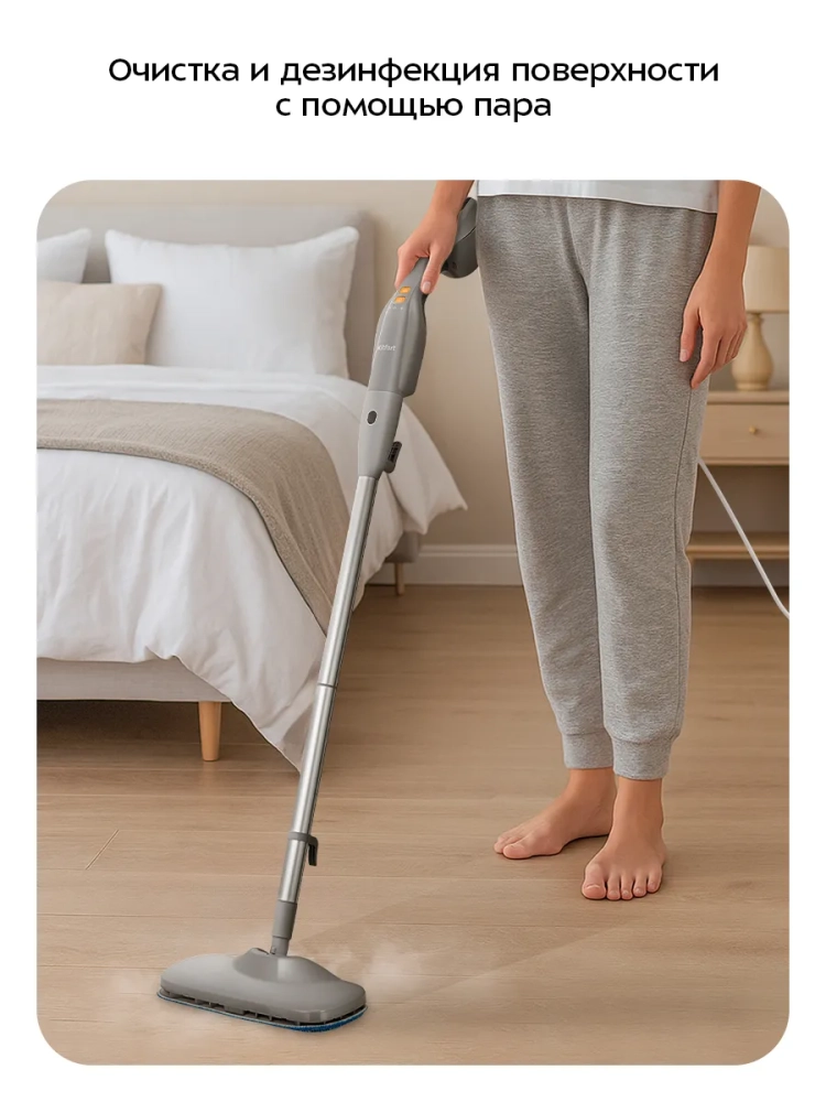 Эта паровая швабра Kitfort также подходит для уборки других поверхностей, благодаря наличию специальных насадок. Мощная паровая струя эффективно справляется с загрязнениями на различных типах полов, обеспечивая качественное мытье и дезинфекцию. Электрическая швабра Kitfort — это надежный помощник в поддержании чистоты и порядка в вашем доме.