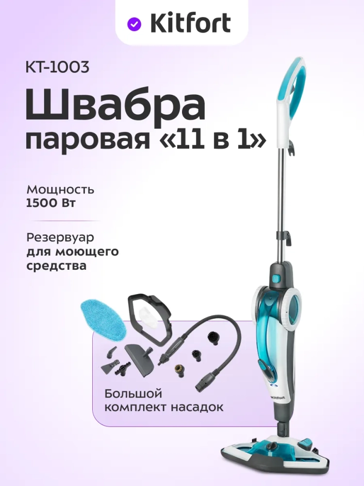 Принцип действия паровой швабры Kitfort КТ-1003 основан на воздействии горячего пара на загрязнения.