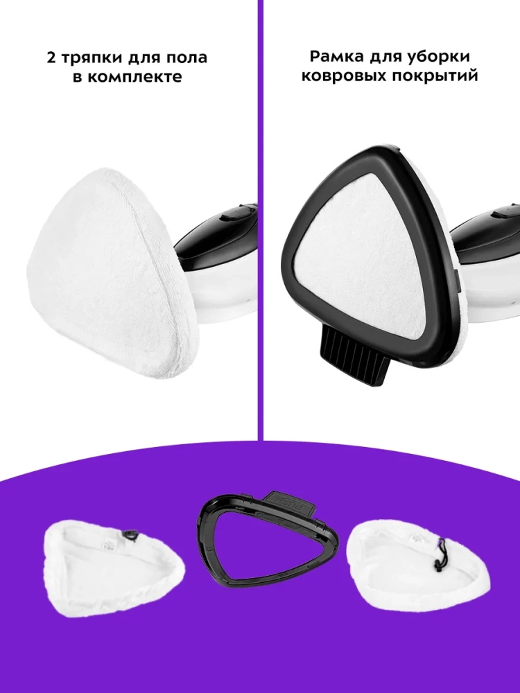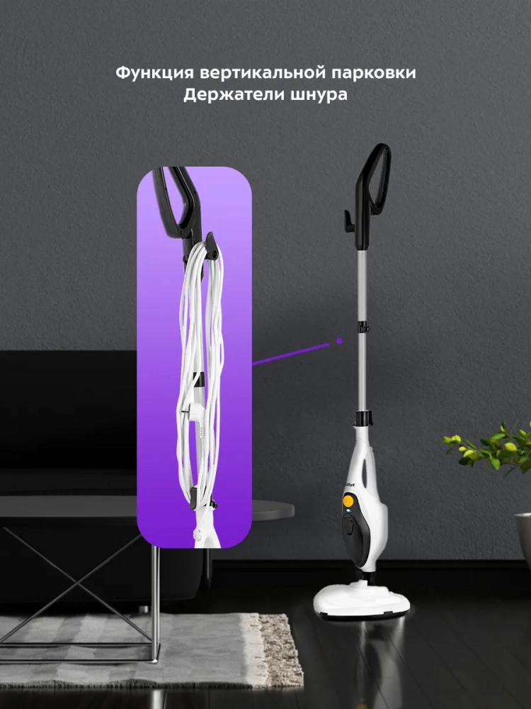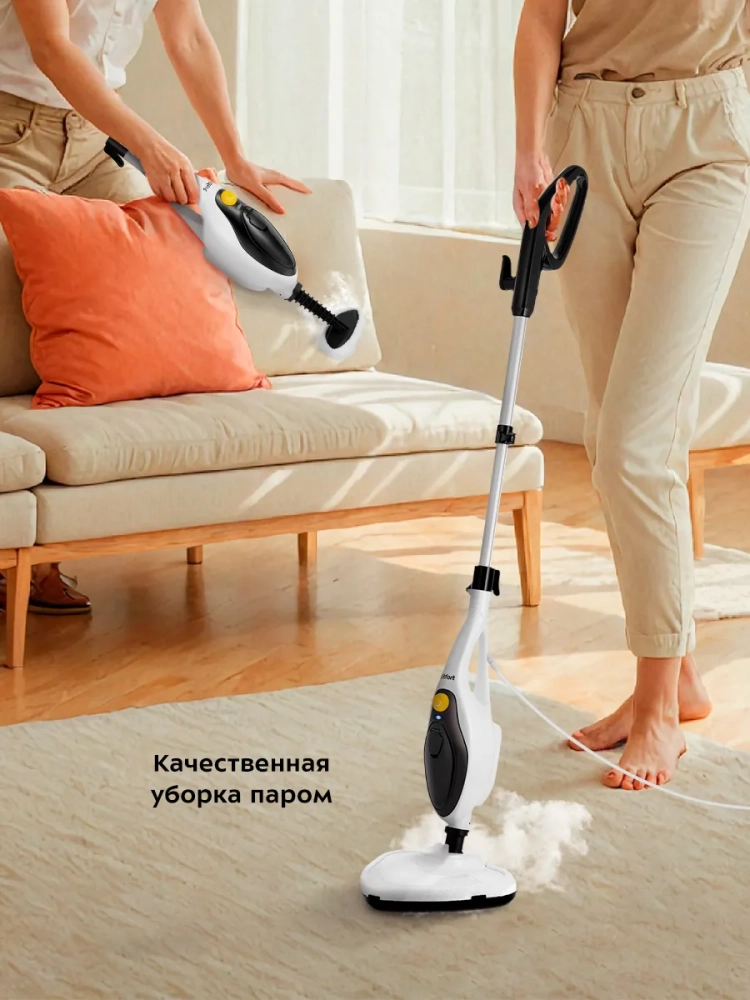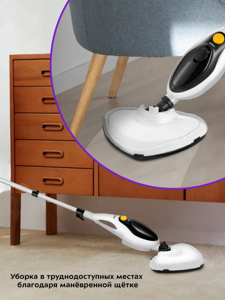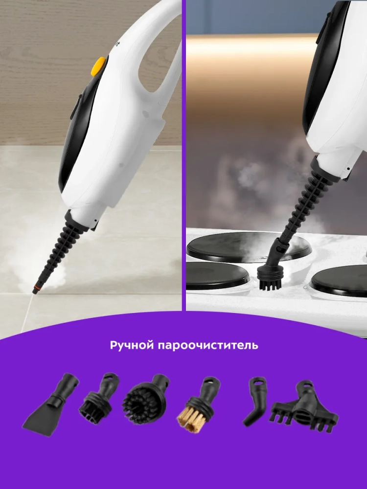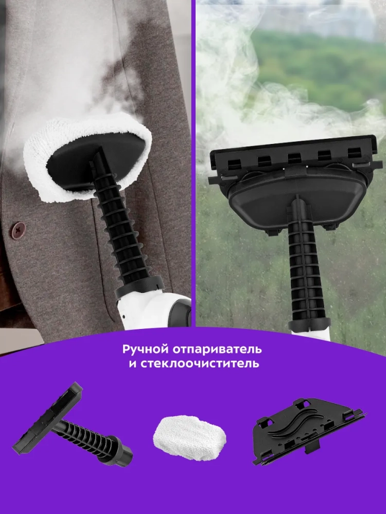 Если отсоединить удлинительную ручку и щетку для пола, то швабра превращается в ручной пароочиститель или отпариватель. Им можно чистить паром различные поверхности и предметы: кафель и швы между плитками, сантехнику для кухни и ванны, духовки, плиты, СВЧ печи, жировые и известковые отложения. Для усиления механического воздействия в комплекте идут ворсовые щетки и скребок.