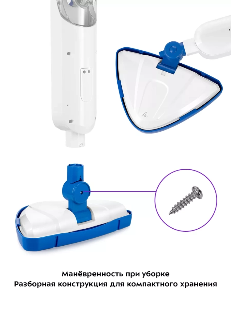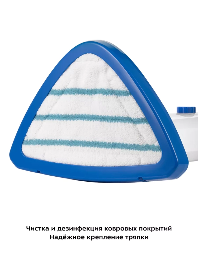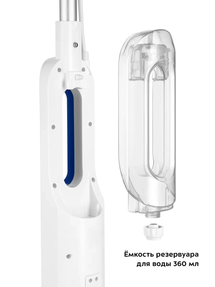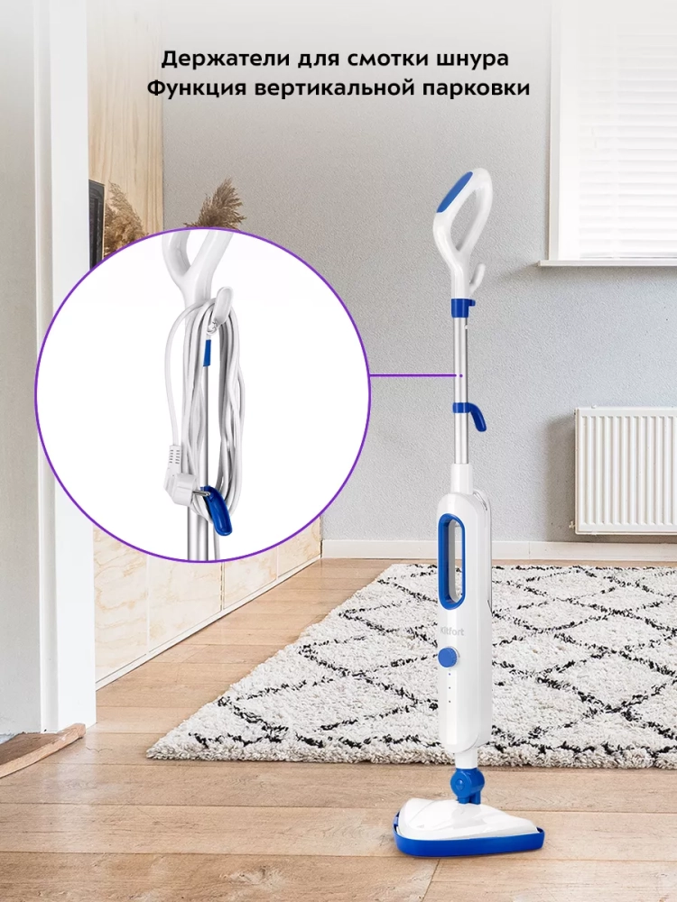 Паровая швабра обладает функцией вертикальной парковки и большим углом наклона при уборке, который поможет легко убирать пространство под мебелью. Напольная щетка закреплена на специальном шаровом шарнире с наклоном в двух плоскостях, что делает швабру очень маневренной и облегчает уборку. Также у паровой швабры предусмотрены держатели для шнура.