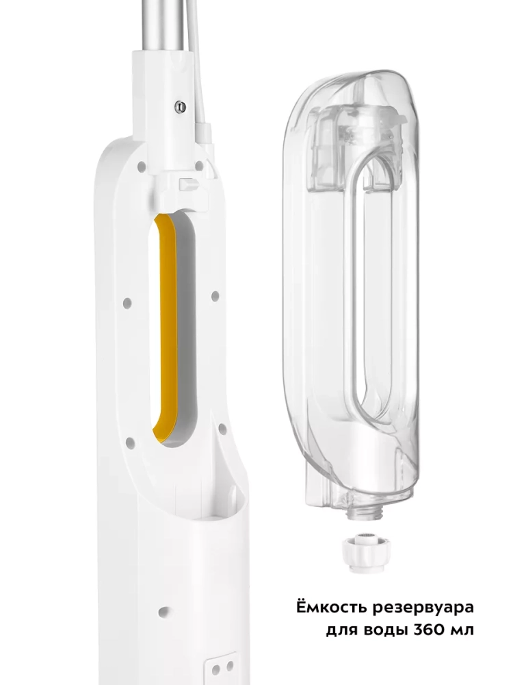 Паровая швабра обладает функцией вертикальной парковки и большим углом наклона при уборке, который поможет легко убирать пространство под мебелью. Напольная щетка закреплена на специальном шаровом шарнире с наклоном в двух плоскостях, что делает швабру очень маневренной и облегчает уборку. Также у паровой швабры предусмотрены держатели для шнура.