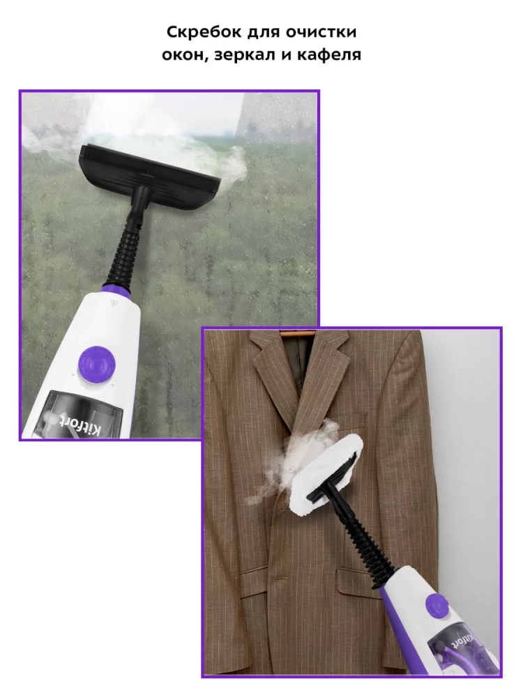 Паровая швабра Kitfort КТ-1050 — универсальное устройство, которое поможет избавиться от пыли и грязи с помощью мощной струи пара, а также продезинфицирует обрабатываемую поверхность. При помощи специальных насадок из комплекта КТ-1050 очистит раковину и плиту на кухне, зеркала, окна и плитку в ванной без каких-либо химических средств, исключительно паром.