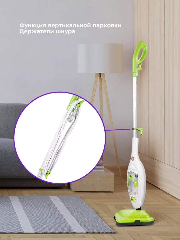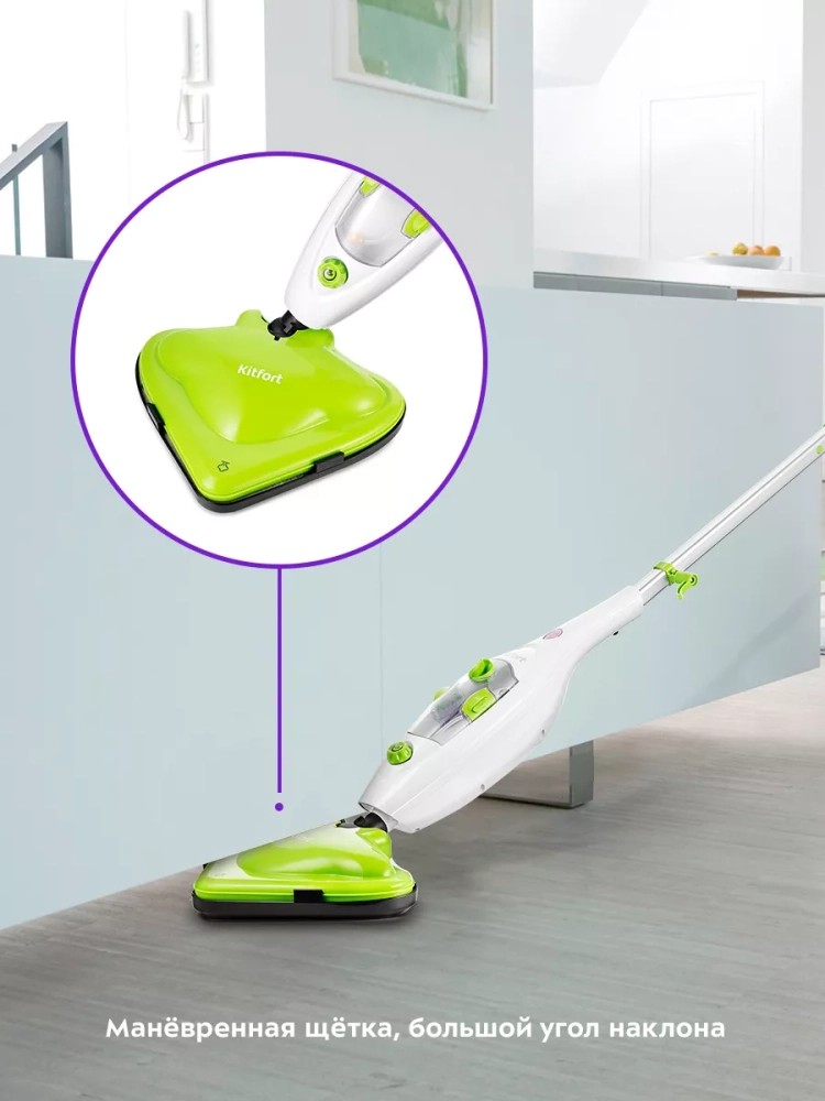 Паровая швабра обладает функцией вертикальной парковки и большим углом наклона при уборке, который поможет легко убирать пространство под мебелью. Напольная щетка закреплена на специальном шаровом шарнире с наклоном в двух плоскостях, что делает швабру очень маневренной и облегчает процесс уборки. На удлинительной трубке предусмотрены держатели для шнура.