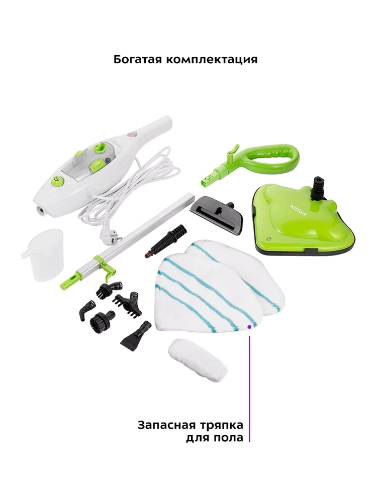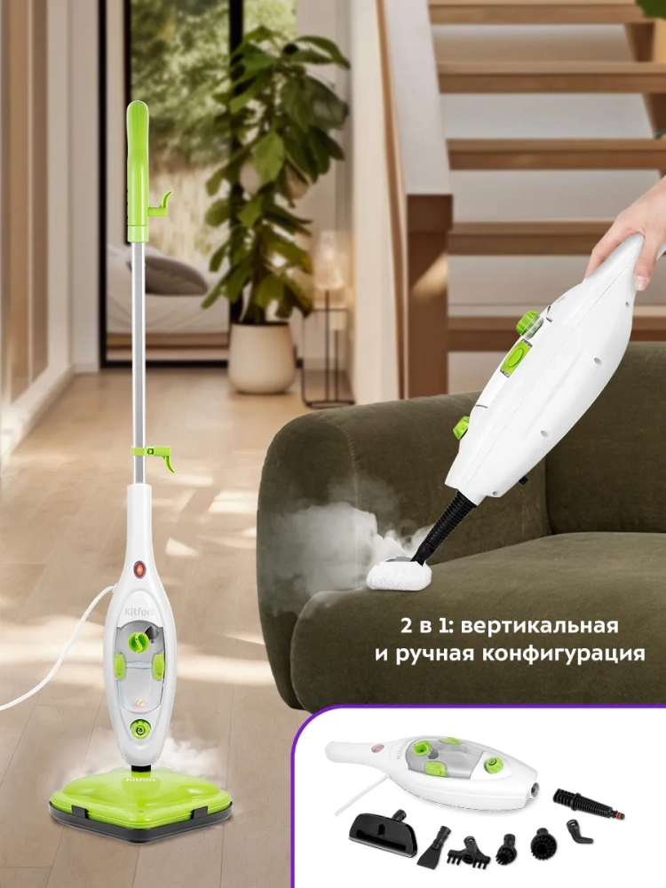 Паровая швабра Kitfort КТ-1060 — универсальное устройство, которое поможет избавиться от пыли и грязи с помощью мощной струи пара, а также продезинфицирует обрабатываемую поверхность. Паровая швабра очистит раковину и плиту на кухне, зеркала и мебель без каких-либо химических средств, исключительно паром.