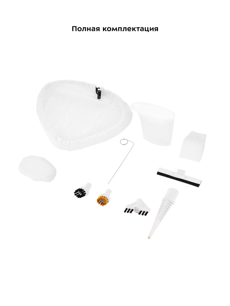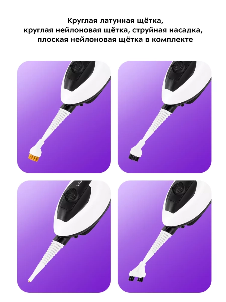 Конструкция «2 в 1» предусматривает наличие ручного модуля, который удобно использовать с насадками. С помощью насадок легко отмыть окна, почистить шторы и мягкую мебель. Латунная и нейлоновые щетки эффективно очищают сложные загрязнения с помощью механического воздействия. В комплекте есть насадка для отпаривания с тряпкой для отпаривания, чтобы отпаривать одежду и чистить обивку мягкой мебели. Насадка с резиновым скребком предназначена для очистки окон, зеркал и кафельной плитки. Струйная насадка поможет очистить щели и углы.
