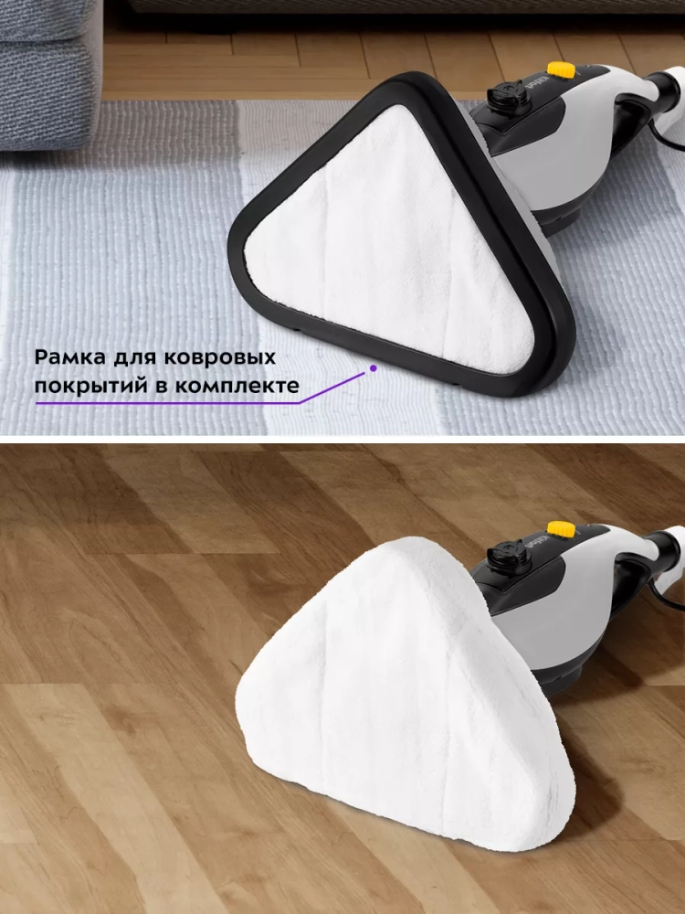 В комплекте есть рамка для ковра, которая обеспечивает легкое скольжение щетки для пола по ковру. С помощью мерного стакана из комплекта удобно заполнять резервуар для воды.