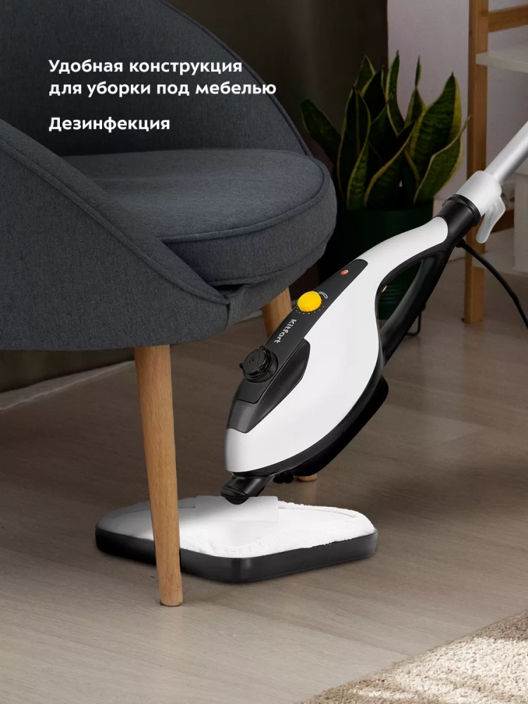 Паровая швабра обладает функцией вертикальной парковки и большим углом наклона при уборке, который поможет легко убирать пространство под мебелью. Напольная щетка закреплена на специальном шаровом шарнире с наклоном в двух плоскостях, что делает швабру очень маневренной и облегчает уборку. На удлинительной трубке с ручкой предусмотрены держатели для шнура.