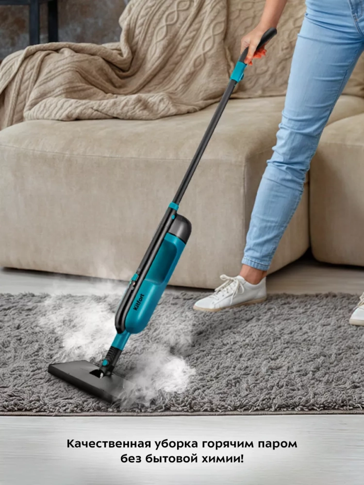 Принцип действия паровой швабры основан на воздействии горячего пара на загрязнения. Пар проникает внутрь загрязнения, размягчая и растворяя его, а затем с помощью тряпки частички грязи смываются. Высокая температура пара способствует процессу очистки. Нерастворимое в воде загрязнение (например, жировое отложение) удаляется аналогичным образом: под действием высокой температуры пара оно размягчается, а пар вместе с механическим воздействием на загрязнение превращает его в эмульсию, состоящую из мелких частичек загрязнения и воды. Эта эмульсия затем может быть легко удалена тряпкой. Во время работы паровой швабры вода из резервуара подается в бойлер помпой (водяным насосом). Для паровой швабры не нужны чистящие средства, поэтому она станет идеальным решением уборки дома для аллергиков. В комплекте предусмотрена рамка для ковра, которая обеспечивает легкое скольжение насадки для пола по ковру.